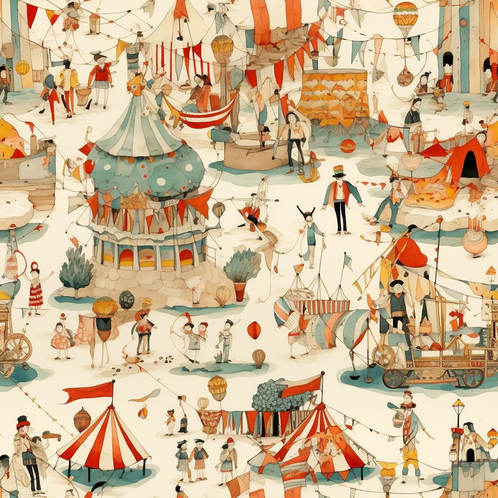 Download for Free!The Carnival Circus pattern is a colorful tapestry featuring an artistic drawing of people in a circus tent. The style of the pattern is reminiscent of pictorial fabrics and dreamy watercolor scenes. The pattern is packed with hidden details, including aerial views and detailed crowd scenes. The light teal and light red colors give it a playful and cheerful feel. This pattern would be perfect for a child's room or for anyone who wants to add a touch of whimsy to their decor.