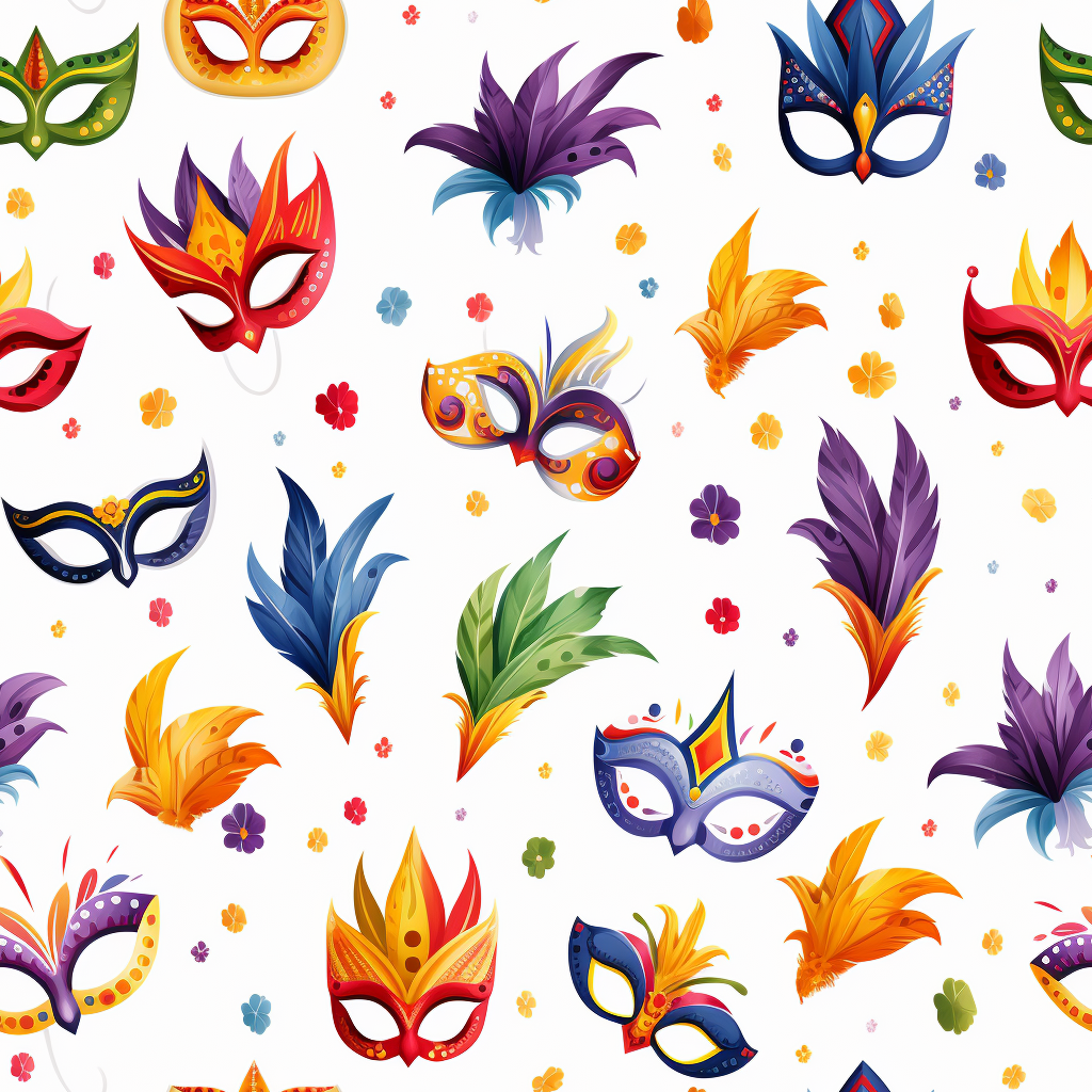 Download for Free!This seamless pattern features a variety of Carnival masks with feathers and leaves in vibrant colors. The style of the painted illustrations is flamboyant and free with dynamic and exaggerated facial expressions. The vintage masks pattern takes inspiration from the Venetian school with detailed costumes and joyful celebration of nature. The Carnival masks stand out on a white background and the patterns are presented in a flat, limited shading style. The high resolution of the pattern allows for detailed observation of the colorful face paint and textures of the fur and feathers. The pattern is a perfect representation of the Carnival spirit and is sure to bring joy and color to any event.