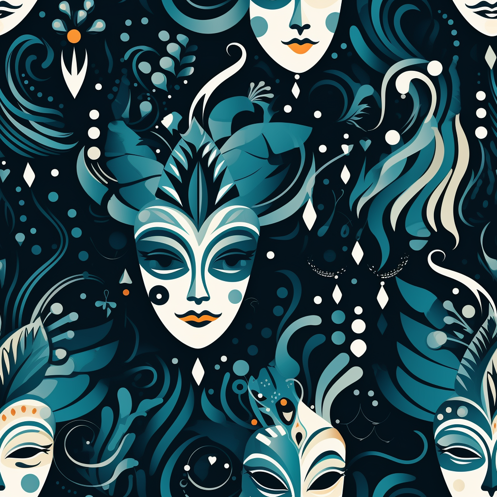 Download for Free!Our Carnival of Masks pattern is a stunning display of colorful masks set against a black background. In the style of fantasy realism, the serene faces of the masks transport you to a contemporary fairy tale world. Venetian scenes and dark green and blue hues add to the dreamlike quality of the illustration. This pattern draws inspiration from traditional oceanic art, mardi gras, and masquerade masks, resulting in a carnivalcore delight for the senses. Featuring high contrast compositions and whimsical figures, our dark teal and light navy pattern also includes surrealist illustrations and vibrant stage backdrops that give it a carnivalesque feel. Perfect for dark fairy tales, our organic and flowing forms add vibrant caricatures and depictions of theater to this eye-catching composition.