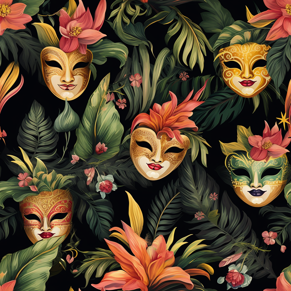 Get ready to be transported to a vibrant carnival atmosphere with our exotic mask and flower pattern!