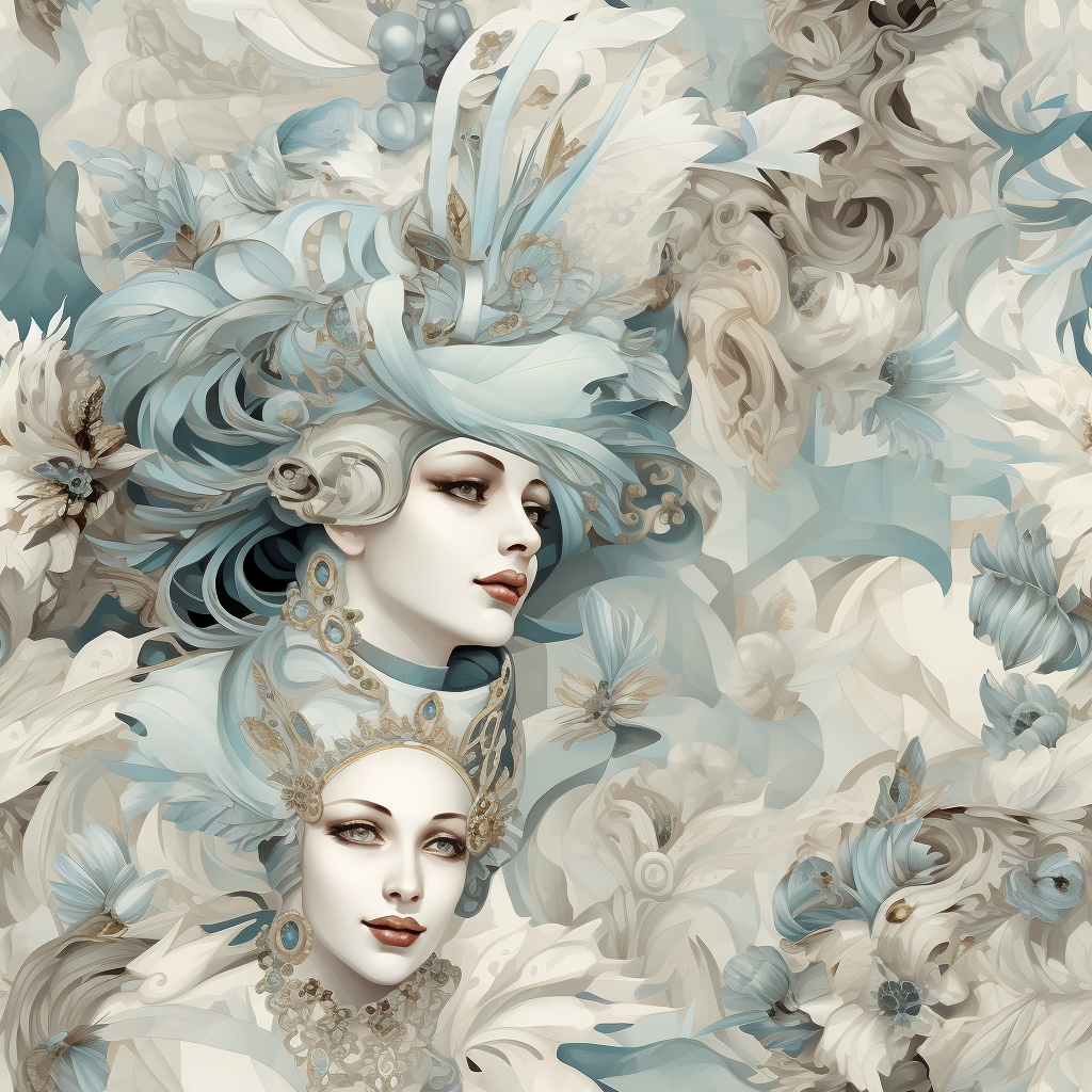 Download for Free!This carnivalcore fantasy depicts two women in fine feather attire, surrounded by intricate floral patterns in light gold and aquamarine hues. Their detailed facial features are framed by multi-layered compositions that give the illusion of illusory wallpaper portraits. The surreal theatrics of the pattern are reminiscent of baroque portraiture, but with a floral surrealism twist. The light silver and azure tones of the mural-like compositions give the pattern a porcelain-like quality. The realistic fantasy of the serene faces transports the viewer to a world of rococo extravagance. The pattern is perfect for those who love the fantastical and whimsical.