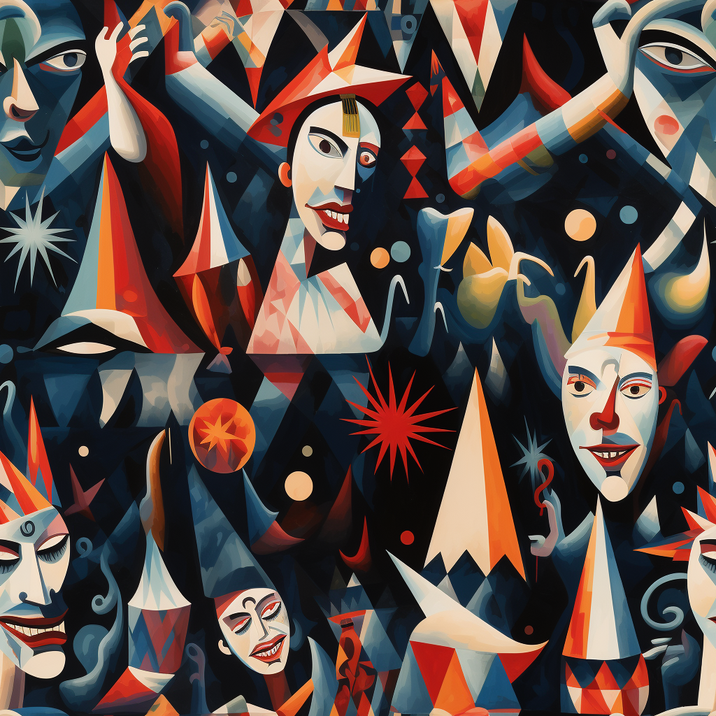 Download for Free!This surreal pattern features a lively crowd scene with various characters sporting different facial characteristics. The geometric surrealism style is reminiscent of eastern orthodox icons, with a cosmic jester twist. The navy and red color scheme adds depth to the detailed crowd scenes, which are Escher-inspired in their illusory wallpaper portraits. This unique pattern could be described as a blend of surreal theatrics and cubist faceting, with mythological influences and densely patterned imagery. The kaleidoscopic, isolated figures are reminiscent of masculine neo-cubism, while the repetition in the pattern echoes the work of Lynd Ward and Natalia Goncharova. Don't miss this carnivalesque and colorfully abstracted piece of art!