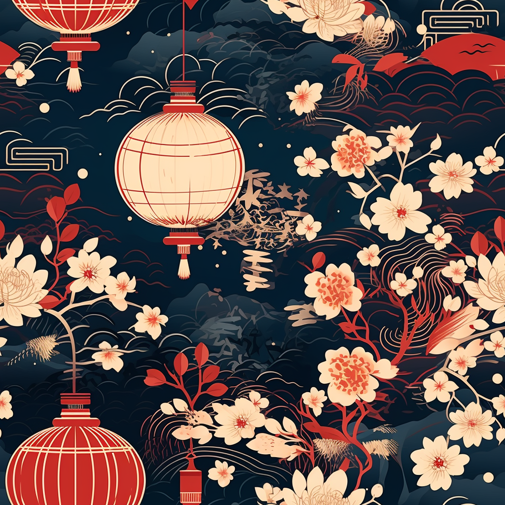 Download for Free!Lantern Festival Dreamscapes is a vivid and colorful pattern that combines traditional elements of Chinese New Year celebrations with vintage imagery. The oriental backdrop features lanterns, flowers and trees that evoke a sense of joy and wonder. The light red and dark indigo color scheme creates texture-rich landscapes that invite the viewer to explore. The luxurious fabrics and detailed dreamscapes exude a sense of elegance and sophistication. The pattern is infused with flower and nature motifs that add a touch of whimsy and playfulness. The light crimson and cartoonish motifs create a nostalgic landscape that transports you to a different time and place. The pattern is inspired by traditional Chinese landscape paintings, and it uses nature-inspired patterns to create a fluid and organic design. The Lantern Festival Dreamscapes pattern is perfect for anyone who wants to add a touch of color and joy to their life!