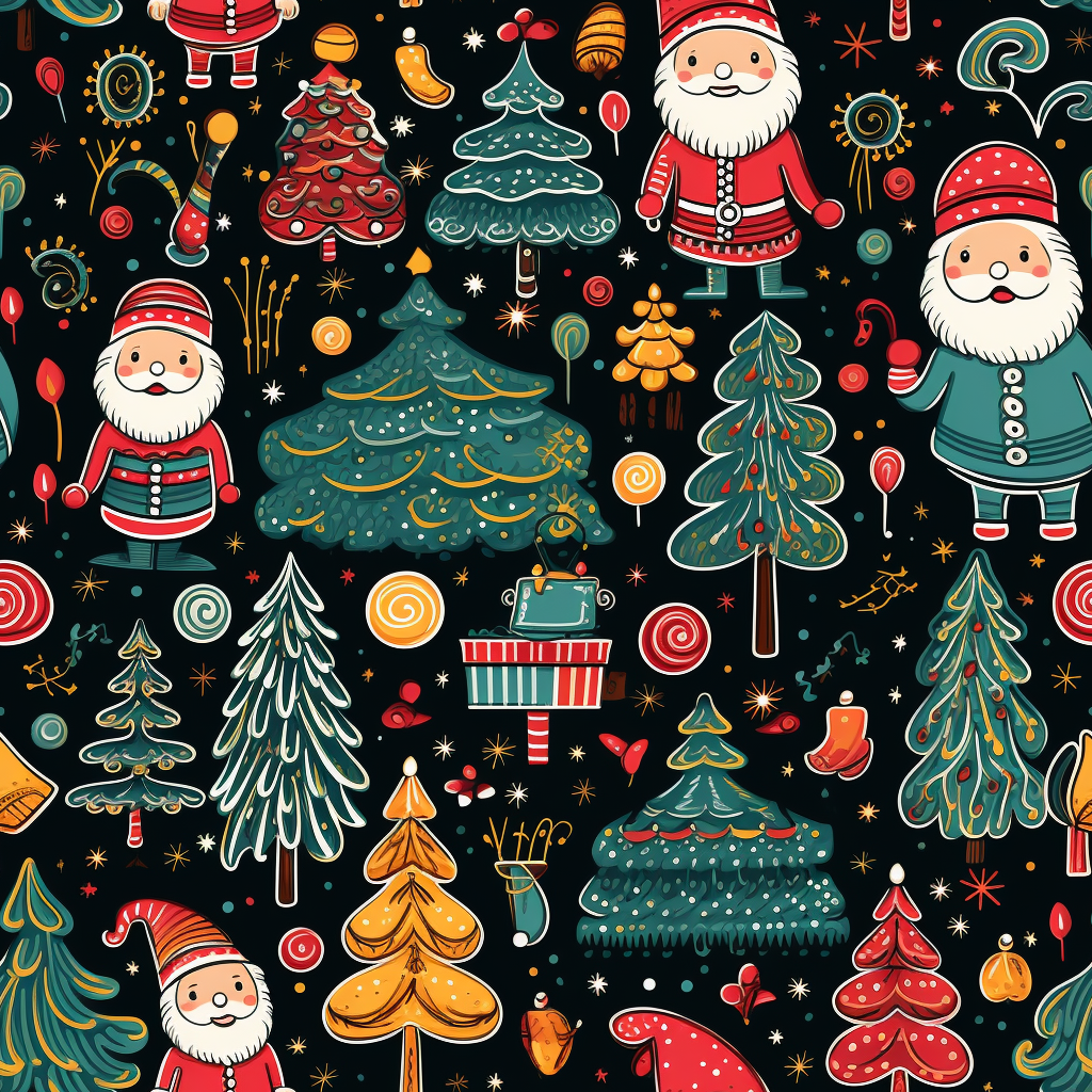 Download for Free!Experience the magic of Christmas with this seamless pattern featuring Santa Claus and trees, set against a black background that's reminiscent of a vibrant stage backdrop. The rustic texture adds a touch of warmth while the whimsical character sketches in teal and red make it a delightful visual treat. Hand-drawn with pattern-based painting, the colorful cartoon of dark teal and light red, detailed character illustrations that combine natural and man-made elements are sure to put you in the holiday spirit. The charming character illustrations are like doodles brought to life, while the ornaments are illustrated with embellishments inspired by colorful woodcarvings. The dark turquoise and light red combination is perfect for those looking for a unique twist on the traditional Christmas colors. With its high resolution, this pattern is perfect for all your festive needs.