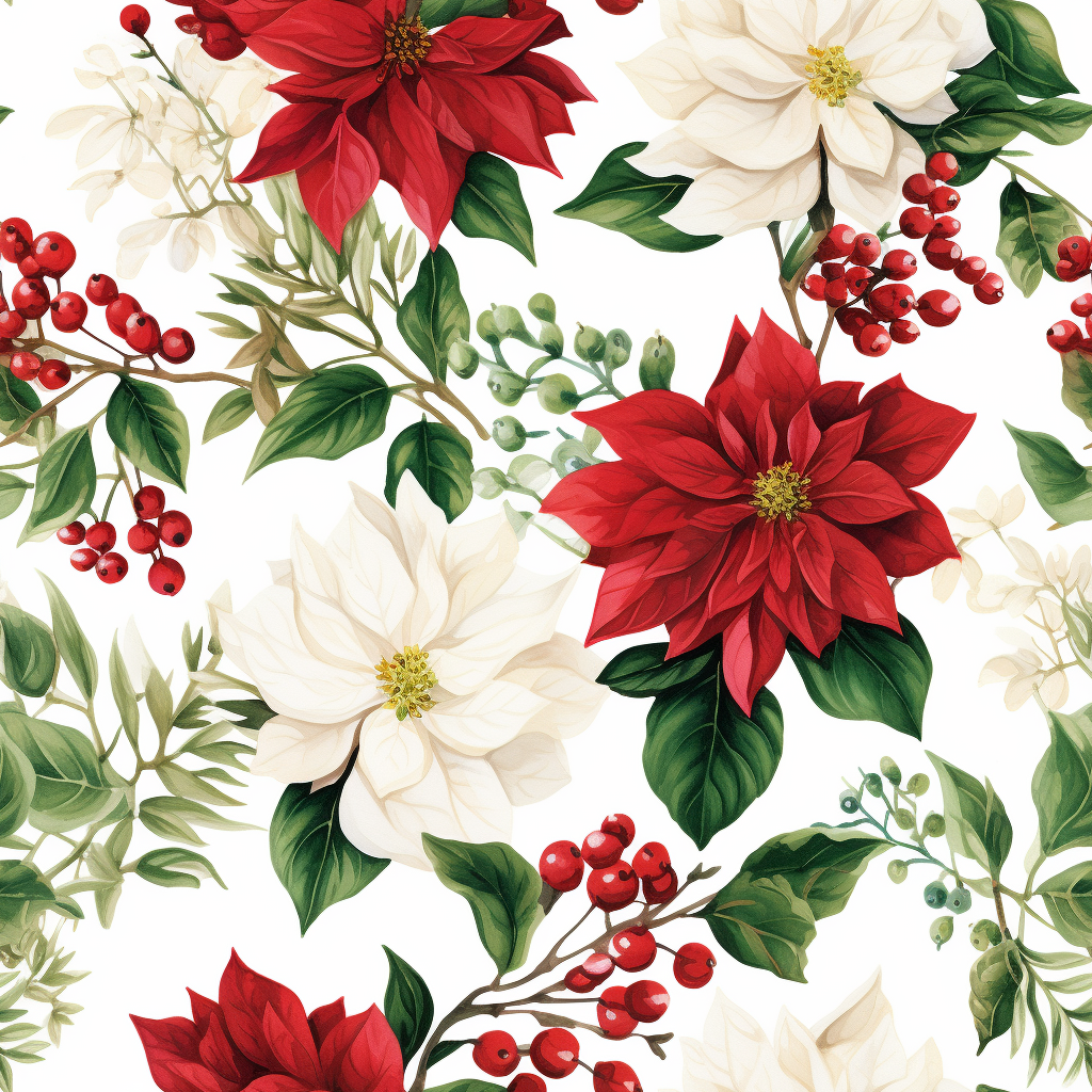 Download for Free!Our seamless Christmas pattern features white poinsettias and holly in a bold color palette, perfect for adding a touch of timeless elegance to your holiday decor. The flourishing botanicals are depicted in an elegant realist style, while the mismatched patterns add an unexpected twist to the design. The white and red color scheme perfectly captures the essence of Christmas, while the seamless pattern ensures a cohesive look. The pattern is available in high-quality UHD image and can be used for a wide range of creative projects. Fun Fact: The poinsettia is named after Joel Roberts Poinsett, the first US ambassador to Mexico, who introduced the plant to the US in 1825.