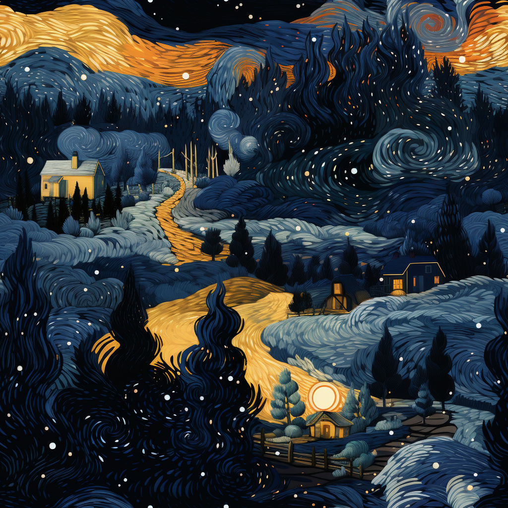 Download for Free!Our Starry Night Cabincore Wallpaper is a breathtakingly beautiful pattern that captures the essence of the whimsical wilderness. The indigo and amber color scheme creates a serene and calming atmosphere, while the swirling vortexes and organic realism add a touch of surrealism to the scene. The hyper-detailed illustrations of rural landscapes, light orange and dark emerald tones, and repeating pattern are reminiscent of the works of a landscape painter. The flowing brushwork and folk art style illustrations are a nod to traditional techniques while maintaining a fresh, modern look. This wallpaper is perfect for those who want to add a touch of nature to their space without sacrificing style. The wallpaper is inspired by the iconic Starry Night painting by Van Gogh, but with a cabincore twist.