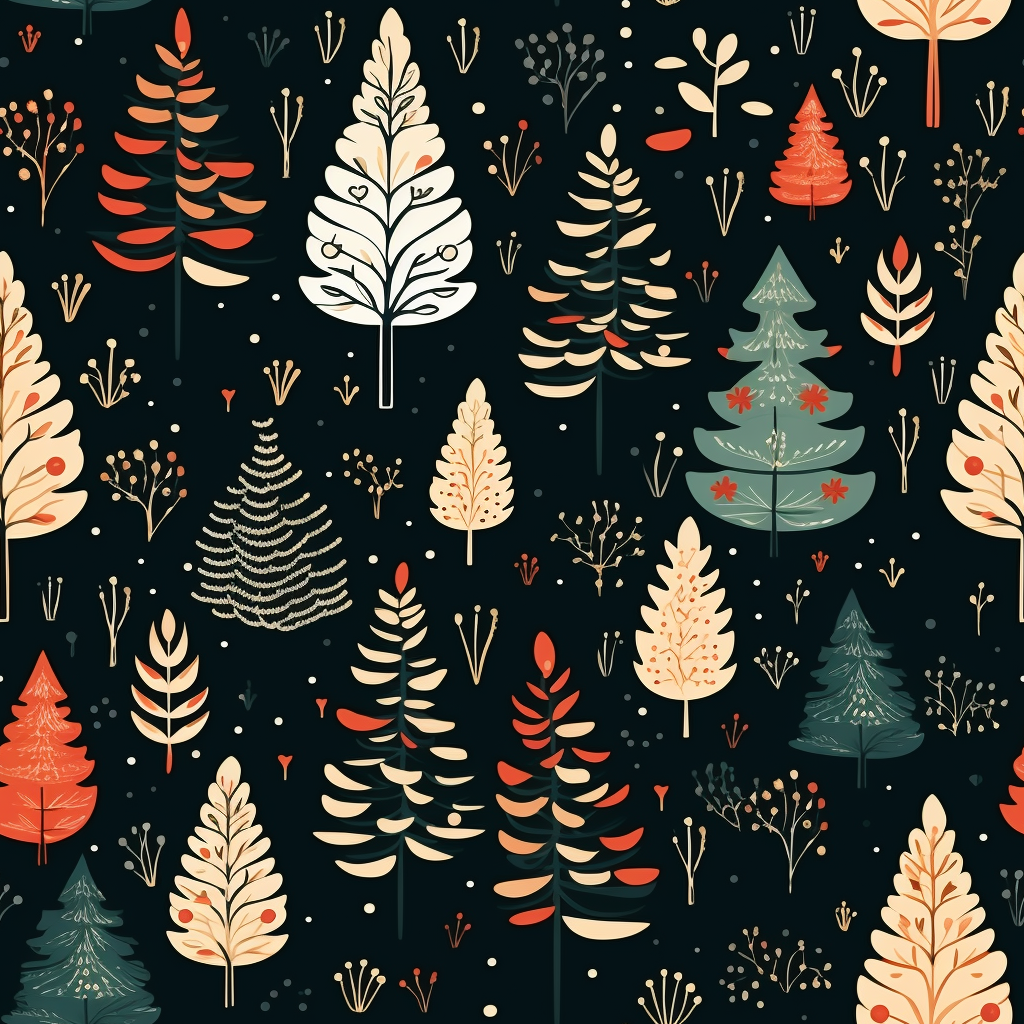 Download for Free!Our Christmas trees seamless pattern features a variety of whimsical trees and leaves in shades of dark indigo and light amber, light red and dark black. The pattern also includes whimsical floral scenes and nature-inspired pieces, all illustrated in a mid-century style. The dark colors of the pattern create a whimsical narrative, with a cabincore feel and hints of dark white and orange. The seamless background is inspired by atmospheric woodland imagery and folk art-inspired illustrations in dark indigo and amber, light red and dark cyan, and natural scenery. The botanical illustrations are detailed and inspired by the 1970s to the present. The pattern also features sequin holly, trees, and berries, perfect for adding some sparkle to your holiday designs.