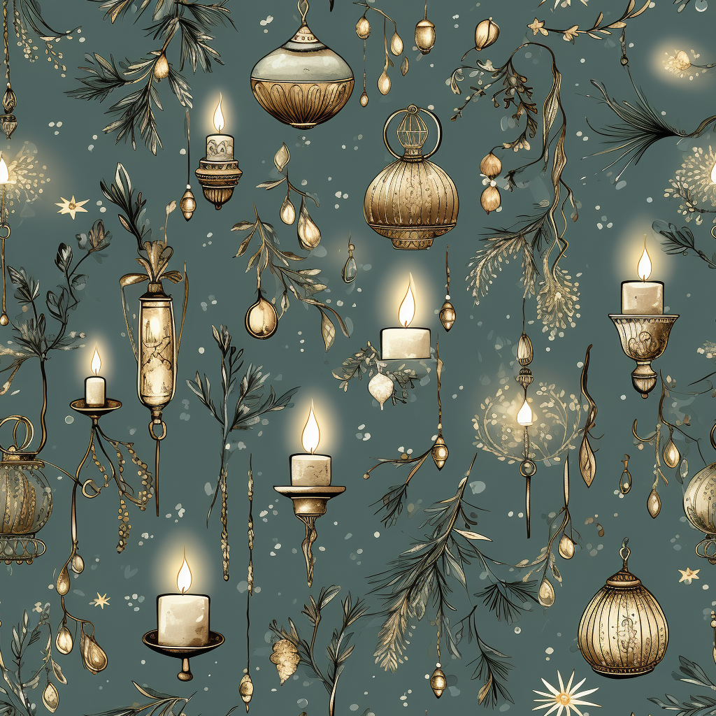Download for Free!This enchanting pattern features candles, pinecones, trees, and leaves, depicted in realistic detail in dark gold and light aquamarine. The lighting is particularly realistic, creating an eerie yet whimsical atmosphere. The ornate decorations and neue sachlichkeit style give this pattern a touch of sophistication. The wreaths on a blue background mix realistic and fantastical elements and are accompanied by luminous spheres. Gray and beige add to the atmospheric woodland imagery. The floral pattern is perfect for wall and ceiling decor, with fairy tale illustrations and glowing lights. Rustic naturalism and festive atmosphere make this pattern a joyful celebration of nature.