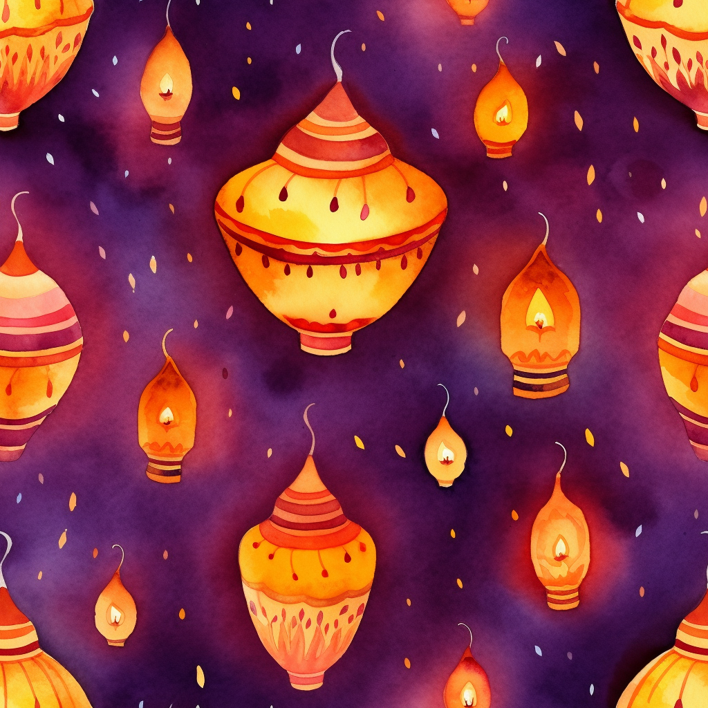 Download for Free!This watercolor seamless pattern features lanterns in a red and purple color scheme, inspired by Indian pop culture. The lanterns are intricately detailed and layered, creating a sense of depth and vibrancy. The festive atmosphere is further enhanced by the otherworldly illustrations, quirky pottery, and animated gifs scattered throughout the pattern. The densely patterned imagery draws the eye in and keeps it engaged, adding a touch of whimsy to any space. The lanterns themselves are reminiscent of glowing lights in the style of Saurabh Jethani's folk-inspired illustrations. The violet and amber hues create a warm and inviting ambiance, perfect for any occasion. Whether used as wallpaper, fabric, or accessories, this pattern is sure to add a touch of playful charm to any space!