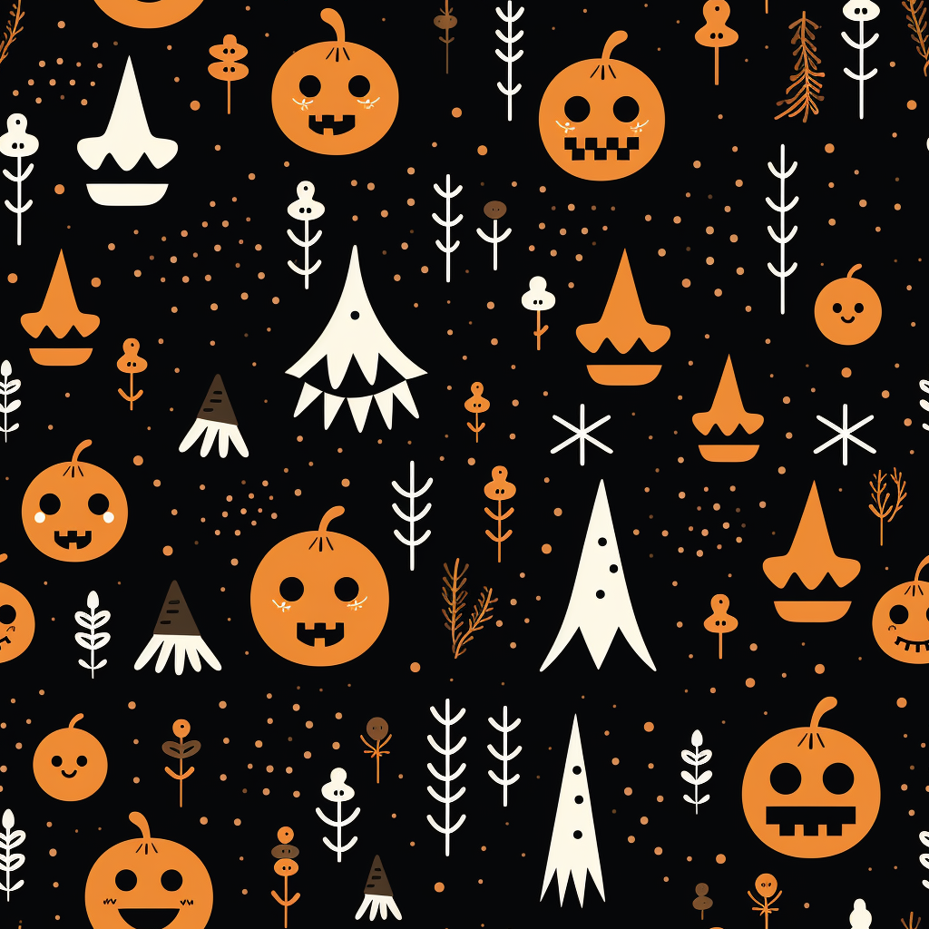 Download for Free!This playful yet dark Halloween Pumpkins and Trees Pattern features orange pumpkins and trees in a folk-inspired illustration style. The playful use of negative space and detailed costumes add to its kitsch and camp charm. The pattern's nature-inspired shapes and dark white and dark black color scheme give it a forestpunk vibe. The quirky character designs and whimsical landscapes are reminiscent of Tove Jansson's work. The heavy texture and crisp graphic design make it a standout piece. The pattern is perfect for anyone who loves flower and nature motifs, and the black background adds to its spooky appeal. This pattern is a great example of the whimsical, childlike figures often seen in Alessandro Gottardo's work, and the rough textures give it a unique, organic feel similar to Jack Hughes' illustrations.