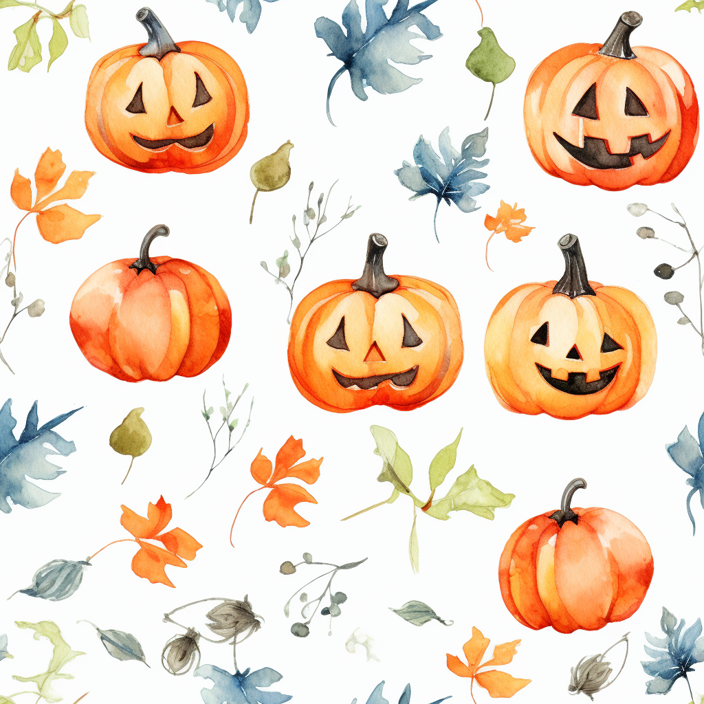Download for Free!This watercolor pumpkin pattern features a background of delicate, hand-painted leaves, in shades of light azure and dark white. The pumpkins themselves are depicted in shades of light orange and dark red, with detailed attention paid to the costume and fashion of each emotive face. The style of the pattern is best described as lowbrow, with a wallpaper-like quality that would make for a striking feature wall in any room. The nature-based patterns are inspired by the work of artists such as Toyen and Wiesław Wałkuski, and the playful expressions of the pumpkins are reminiscent of the lively illustrations of Ben Wooten. The transparent layers of the watercolor paint create a sense of depth and texture, making this Halloween pattern a real feast for the eyes.