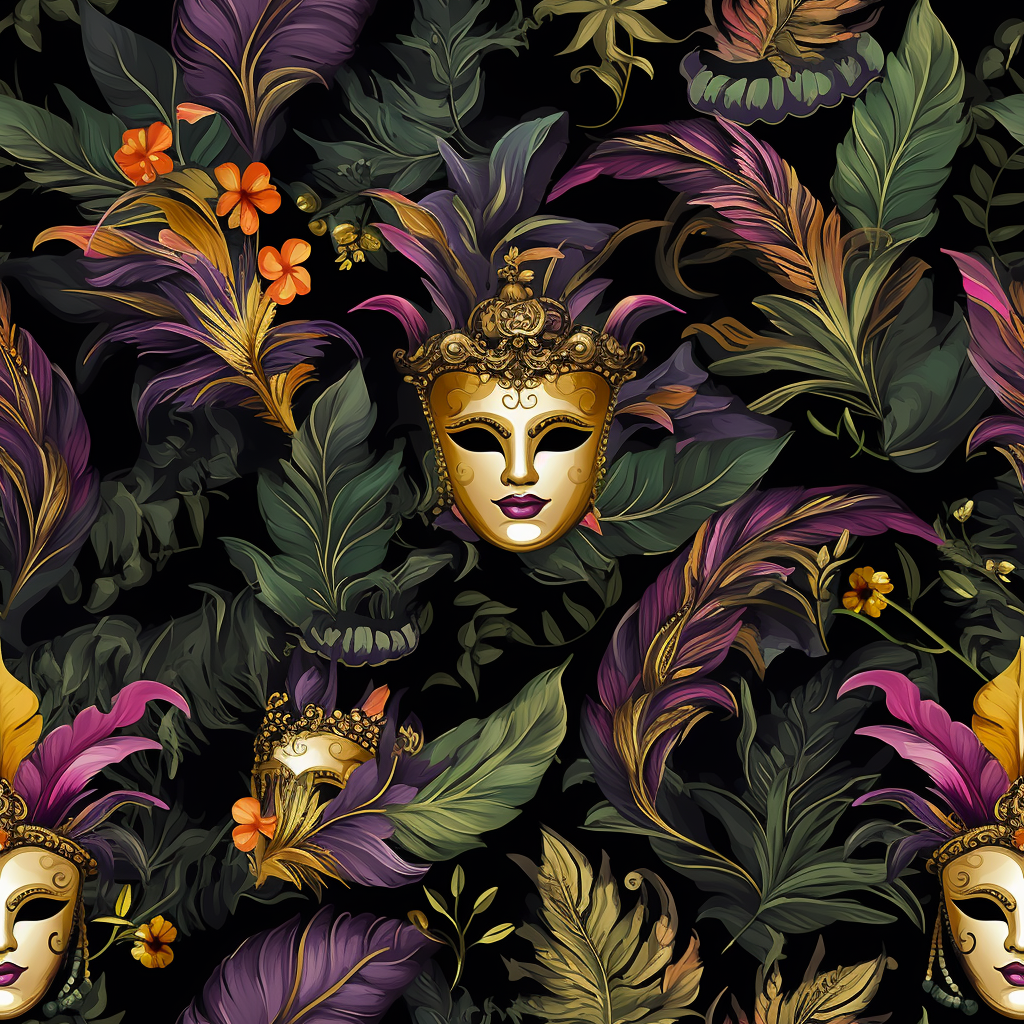 Download for Free!This seamless pattern features a colorful array of Mardi Gras masks and tropical palm leaves set against a black background. The masks are depicted in a vibrant caricature style, with exquisite clothing detail that adds to the luxurious feel of the pattern. The venetian scenes and dark, foreboding colors give the pattern a cinematic elegance that would make it perfect for use in theatre production design. The highly-detailed foliage and mysterious backdrops add to the sense of Renaissance realism, while the use of dark magenta and dark amber create a sense of dark fairy tale whimsy. The pattern is digitally enhanced, with a velvia finish that brings out the richness of the colors and the luxurious fabrics.