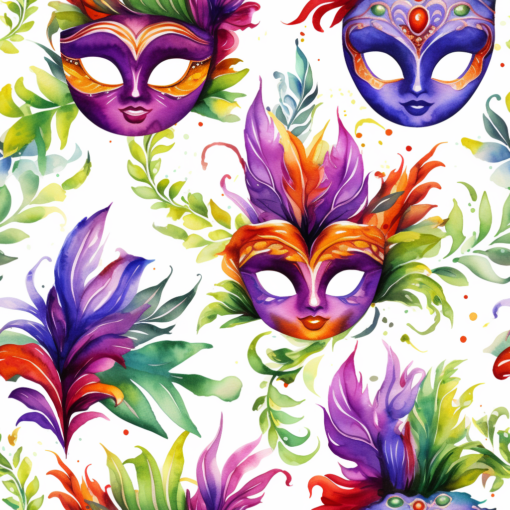 Download for Free!This Mardi Gras watercolor pattern is a colorful and joyous celebration of the carnival season. Whimsical masks and feathers are set against a seamless backdrop of flowers, vines, and birds. The pattern is reminiscent of the Venetian school of painting, with its lively and emotive faces. The white and purple color palette is both flamboyant and elegant. The pattern has been digitally enhanced to create a vibrant and detailed composition, with multicolor costumes made of vines and emotive caricatures. The repeating pattern is inspired by fantasy illustrations and is perfect for creating a range of products, from home decor to fashion accessories.