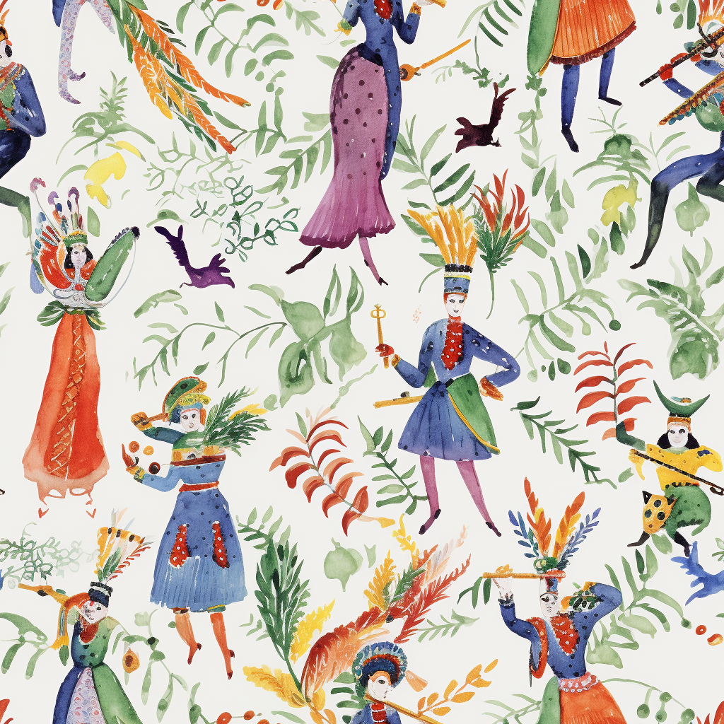 Download for Free!This watercolor pattern features a variety of colorful figures in theatrical poses. The figures are inspired by folk art and illustrated in a high resolution style that captures their graceful movements. The pattern includes birds, flowers, and foliage, and is reminiscent of the fauvist style of painting. The figures are portrayed in a figura serpentinata style, which emphasizes organic movement and flowing lines. The comical choreography of the figures is reminiscent of Polish folklore motifs, with a touch of the reimagined classical forms of the Washington Color School. The pattern includes elaborate costumes and lively interiors that add to the overall exuberance of the design. Use this pattern to add a joyful touch to any room!
