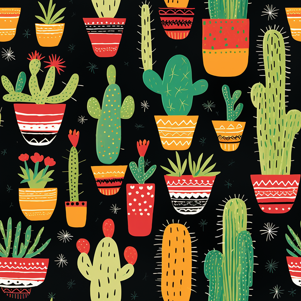 Download for Free!This playful cactus pattern features a variety of colorful cacti set against a dramatic black background. The cacti are rendered in a whimsical style, with bold lines and bright colors that draw the eye. The repeating pattern creates a sense of movement and adds to the overall playful feel of the design. The use of bright reds and greens adds a pop of color, while the intricate textile patterns and mesoamerican influences lend a touch of sophistication. The pictorial fabrics and cartoonish lithographs give the design a fun and funky feel, making it perfect for a variety of applications. Whether you're looking to add a touch of whimsy to your home decor or create a one-of-a-kind piece of clothing, this cactus pattern is sure to inspire your creativity!