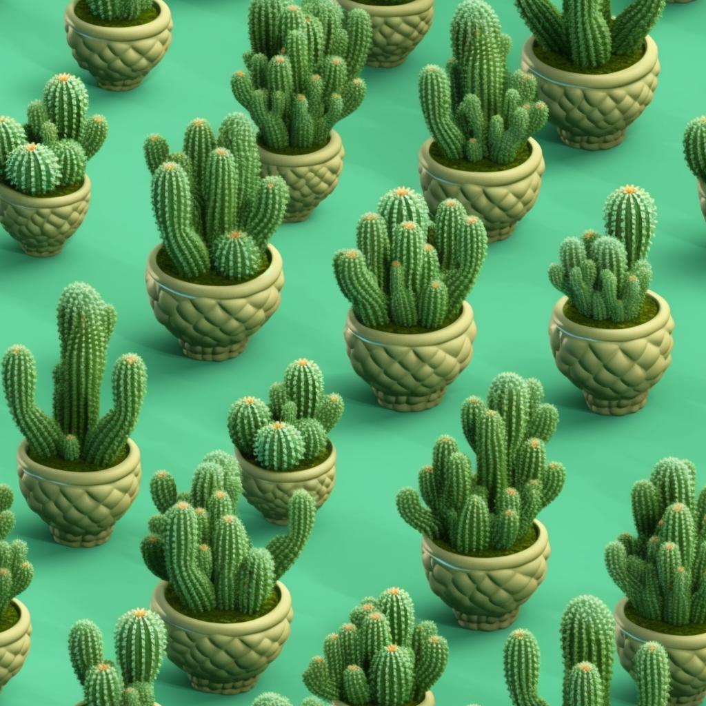 Download for Free!This charming pattern features hundreds of miniature cacti in green pots against a symmetrical green background. The 3D rendering adds depth and realism to the image, while the generative art style gives it a unique flair. The pattern is reminiscent of traditional Mexican designs, with a mosaic-like quality that draws the eye. The cacti are highly detailed, with soft shadows that add dimensionality. The symmetrical composition is pleasing to the eye, with a birds-eye-view perspective that makes it feel like you're looking down on a beautiful garden. Whether you're a fan of desert plants or just looking for a playful pattern, this symmetrical cactus design is sure to delight.