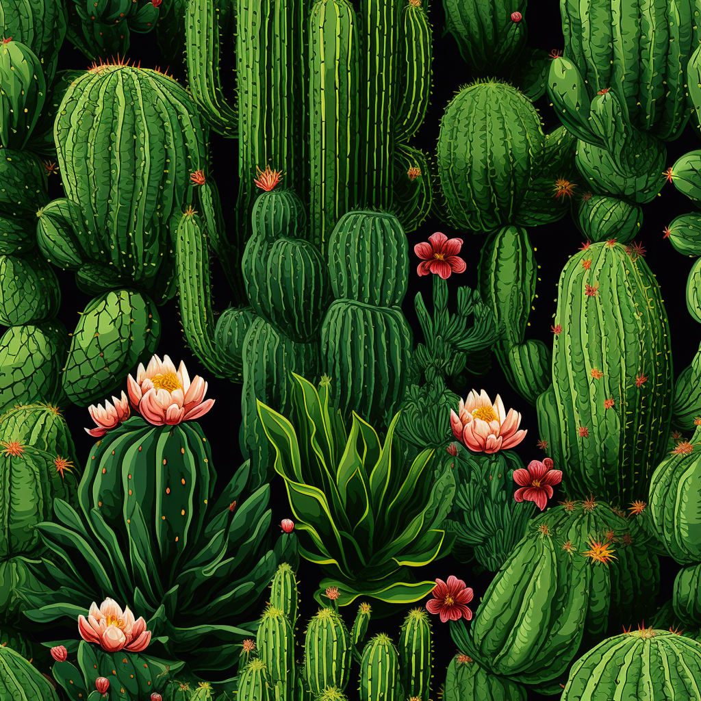 Download for Free!Get lost in the beauty of the desert with Cactus Paradise, a stunning and highly detailed pattern that features a variety of cactus plants and flowers set against a black background. The texture-rich landscape and repeating pattern create a realistic and immersive landscape that will transport you straight to the heart of the desert. The lush scenery, hidden details, and detailed engraving make this pattern a true work of art that will add life and personality to any space. Inspired by the works of Takehiko Nakafuji, Mark Henson, Magali Villeneuve, Adonna Khare, and Edward Poynter, Cactus Paradise is a modern take on the hyper-detailed illustrations of the past, infused with the vibrant colors of the present. Whether you're a fan of pixel art, watercolors, or desertwave, Cactus Paradise has something for everyone.