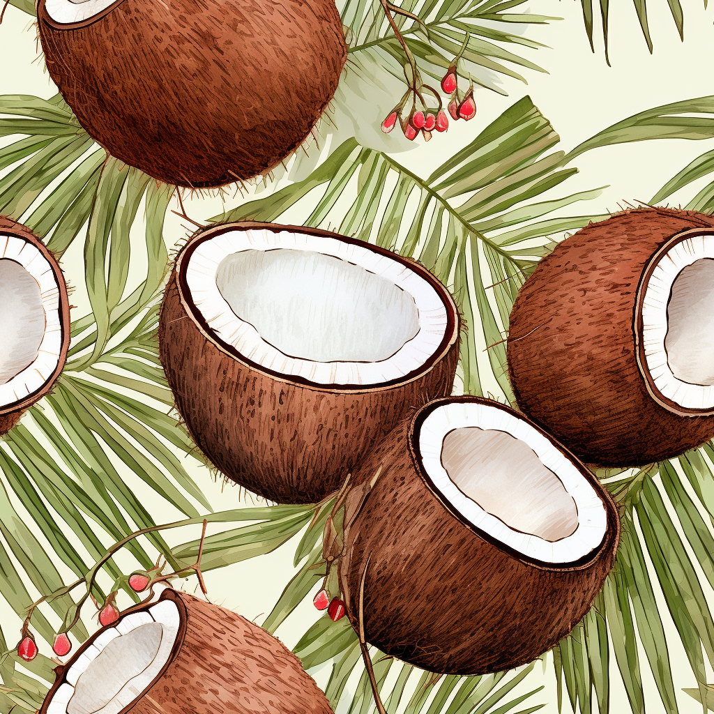 Coconut Paradise is a seamless pattern that features a variety of coconuts, berries, and leaves arranged in a realistic and highly detailed manner. The organic and vibrant nature of the pattern is sure to transport you to a tropical paradise. The pattern is perfect for adding a touch of summer to your designs. The coconuts, berries, and leaves are arranged in a variety of ways, creating a seamless experience that is easy on the eyes. The pattern is inspired by nature and is true to life, with realistic details that make the coconuts and berries look almost good enough to eat! The resolution of the pattern is 3840x2160, making it perfect for high-quality prints and digital designs.