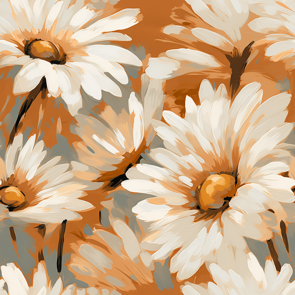 Daisy Delight is a charming pattern featuring beautiful white and brown flowers on a light orange and dark gray background. The brushwork is free and fluid, evocative of the style of decorative backgrounds. The paint dripping technique employed by the artist creates a dynamic effect that draws the eye. The green leaves add a perfect touch of contrast to the tan background, which is designed with fluid brush strokes. The color schemes used in this pattern are realistic and evoke a sense of nature. Daisy Delight is perfect for anyone looking for a pattern that is both playful and elegant.