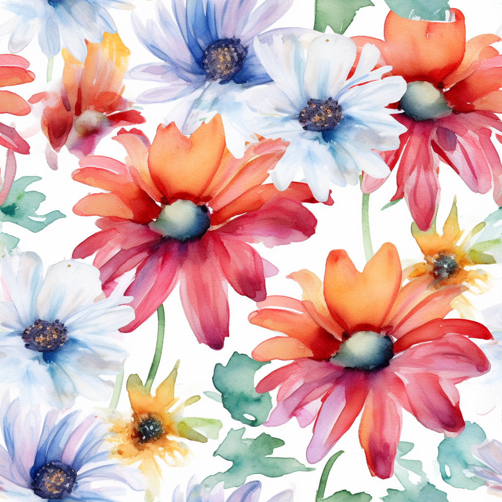 Download for Free!This watercolor seamless pattern features a white background with bright and colorful daisies. The flowers are painted in a realistic style with bold yet graceful strokes. The pattern is layered and textured with heavy use of palette knives. The use of light white and red colors give the pattern a joyful celebration of nature. The pattern is inspired by colorful absurdism and classical motifs and themes. The use of flowing fabrics and shaped canvas make this pattern unique and playful.
