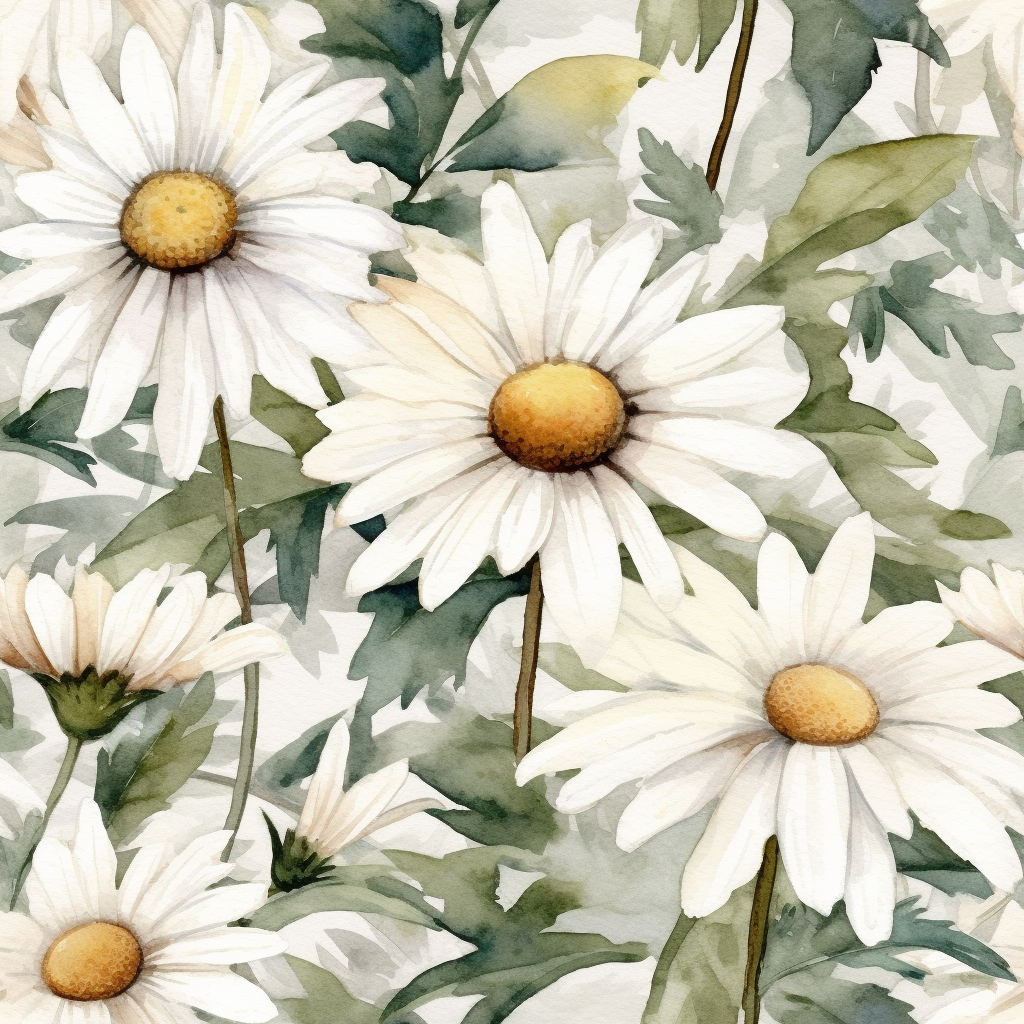 Daisy Dreams is a gorgeous floral pattern that features delicate white daisies with leaves set against a white and beige watercolor background. The pattern is seamlessly repeated to create a stunning wallpaper that will bring a touch of nature to any room. The watercolor technique used in this pattern gives the daisies and leaves a highly detailed, realistic look that will make you feel like you are staring at a beautiful watercolor painting. The heavy shading and skillful composition make this pattern a contest winner. Daisy Dreams is perfect for nature-based patterns and prairiecore styles.