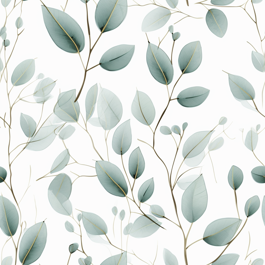 Eucalyptus Delight is a seamless pattern that features delicate blue-green leaves with hints of light gold and light gray, set against a serene white background. The leaves are drawn in a transparent and minimalist style, making them look light and airy. The delicate flowers add a touch of elegance to the pattern. This pattern is perfect for anyone who wants to bring a touch of nature into their space. Eucalyptus, known for its healing properties, is a great way to add some freshness to your environment. The pattern is seamless, which means it can be repeated infinitely without any visible seams. The lightness and transparency of the pattern make it perfect for a variety of applications, such as home decor, stationery, or even fashion. Eucalyptus Delight is a great choice for anyone who wants to create a peaceful and calming space.