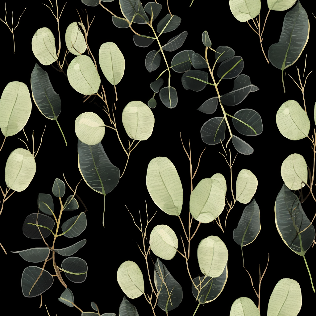 Download for Free!Experience the beauty of nature with this stunning eucalyptus leaf pattern. The botanical illustration of the textured leaves and branches is set against a contrasting black background, creating a striking design. The minimalist style of the pattern makes it perfect for a wide variety of applications, from home decor to fashion. The silver and green color palette, combined with the naturalistic landscape appearance, romanticizes nature and creates a relaxing and soothing atmosphere. The bronze tones add warmth and a touch of luxury to the design. The texture-rich pattern is seamless, allowing it to be tiled easily for larger applications. Inspired by Australian tonalism, this pattern has a realistic, detailed rendering, making it perfect for nature lovers. The pattern is created using gouache, mundane materials, and an earth tone color palette, making it eco-friendly. Fun fact: Eucalyptus leaves have been used for medicinal purposes by indigenous Australians for centuries.