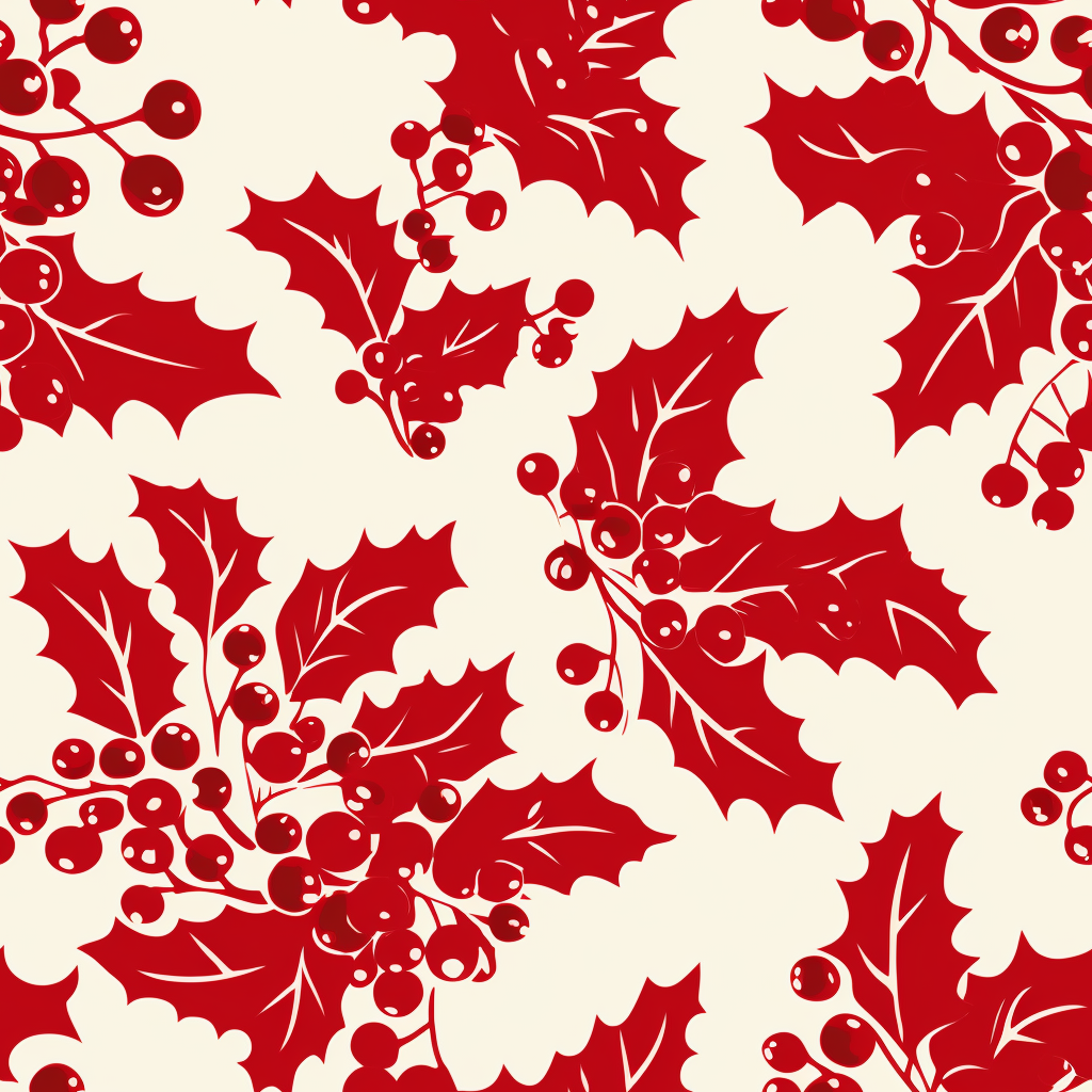 The Holly Leaf pattern features bold graphic patterns of holly berries on a beige background. Reminiscent of traditional Christmas designs, this pattern incorporates organic biomorphic forms while maintaining a high resolution. The leaf patterns and woodcut-inspired graphics give it a classic feel while the marbleized pop art-inspired graphics add a modern twist. The comic book-style graphics with repetition and pattern create flowing silhouettes with delicate markings and bold colors. This patchwork pattern is perfect for those looking for a versatile pattern with a touch of holiday spirit.