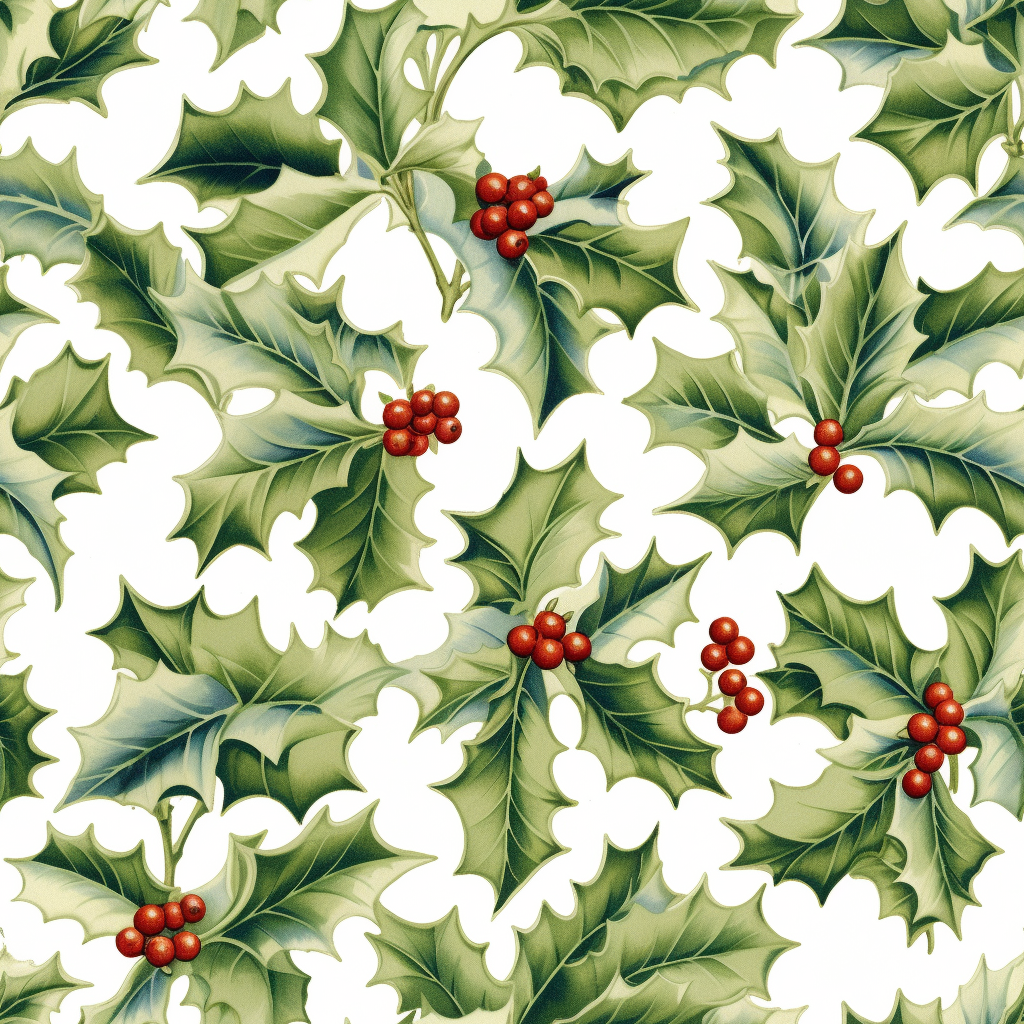 Download for Free!This botanical illustration features colorful holly leaves and berries in detailed shading and classical motifs. The organic designs are reminiscent of traditional pictorial fabrics and are perfect for adding a touch of nature to your decor. The pattern is high resolution and contains hidden details such as distinctive noses and opulent fabrics. The allover composition is perfect for creating a cozy and inviting atmosphere. The pattern is digitally enhanced and uses holotone printing to ensure accurate and realistic detail. The holly leaves pattern is a classic design that is perfect for the holiday season or any time of year when you want to bring a touch of nature indoors.