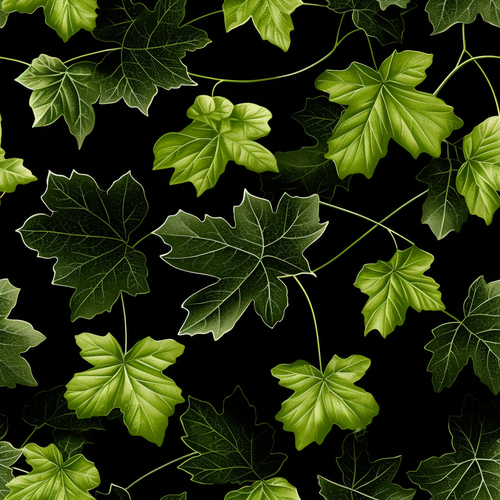 Download for Free!Green and lush ivy leaves climb along a black background, combining natural and man-made elements. The intricate detailing, made in the style of highly detailed and realistic illustrations, makes the leaves almost jump out of the fabric. The use of fujifilm velvia gives the pattern an extra radiant touch, with clusters of leaves that seem to glow. The pattern can be described as caravaggism, an artistic style that emphasizes dramatic contrasts between light and dark. The vines that make up the leaves are highly detailed and accurate, giving the pattern a realistic hyper-detail effect. The hibiscus leaves pattern seamlessly blends in with the woodland goth aesthetic, making it perfect for lush landscape backgrounds.