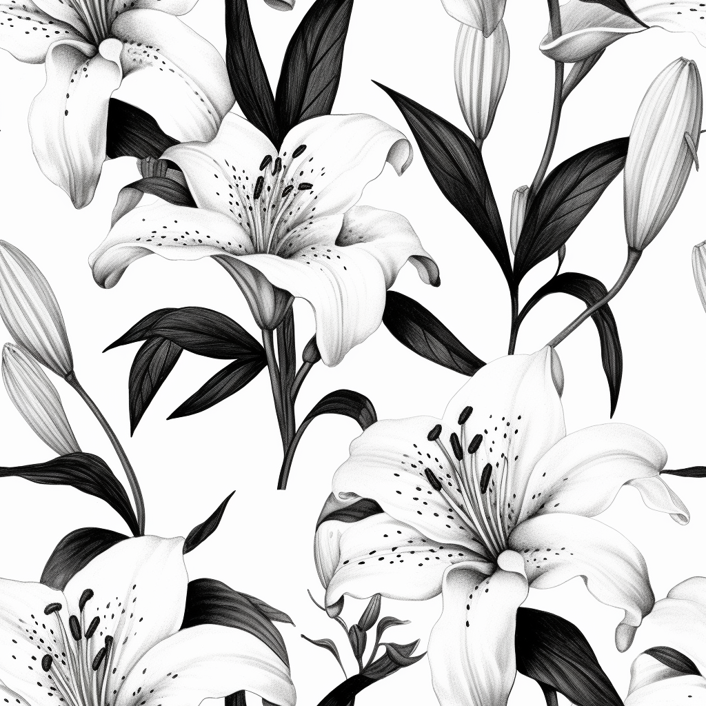 Download for Free!This beautiful digital illustration features black and white lilies set on a white background. The monochrome nature-based pattern is both realistic and hyperrealistic, with intricate details that bring the flowers to life. The clean and simple design is reminiscent of vintage repeating patterns and would be perfect for adding a touch of elegance to any project. The realistic color palette makes it a versatile choice for a variety of applications.