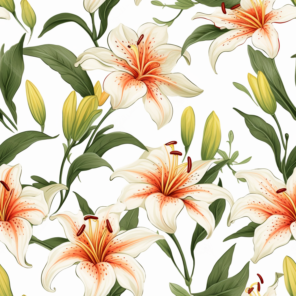 Download for Free!This seamless pattern features beautiful orange and white lilies on a white background. The intricate detailing and shading in the lilies give it a realistic and botanical feel. The leaves are also detailed and nature-based, adding to the overall organic look of the pattern. The seamless design makes it perfect for large-scale prints. This style of detailed botanical illustrations is reminiscent of the work of Lilia Alvarado. The color palette is light and bright, with light oranges, pinks, greens, and beige. The use of precise linework and hyper-detailing give it a highly realistic feel. The wallpaper border pattern features an orange and white lily flower with detailed background elements, while the collection of white and orange lilies on a white background creates a repeating pattern. Overall, this pattern is a beautiful representation of nature and would be perfect for a variety of applications.