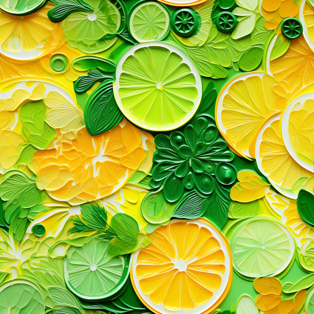 Citrus Foliage is a pattern that features cut up citrus slices in many colors and textured textures, in the style of paper sculptures, highly detailed foliage, poured, monochromatic works, yellow and green, patterns, grandiose color schemes. The pattern is made with lemon slices and limes, in the style of paper sculptures. The pieces are arranged in a way that brings to mind colorful mindscapes, diverse color palette, matte photo, nature morte, lush and detailed. The orange and lime leaf-shaped paper cut with yellow leaves and slices are in the style of meticulous photorealistic still lifes, elaborate fruit arrangements, decorative backgrounds, monochromatic palettes, green, colorful, eye-catching compositions, thick impasto texture. The lemon slices and green onions in cut paper, in the style of colorful mindscapes, detailed, and intricate compositions, are made of plastic, relief, botanical abstractions, vibrant color palettes. This pattern is perfect for anyone looking to add a pop of color and fun to their life.