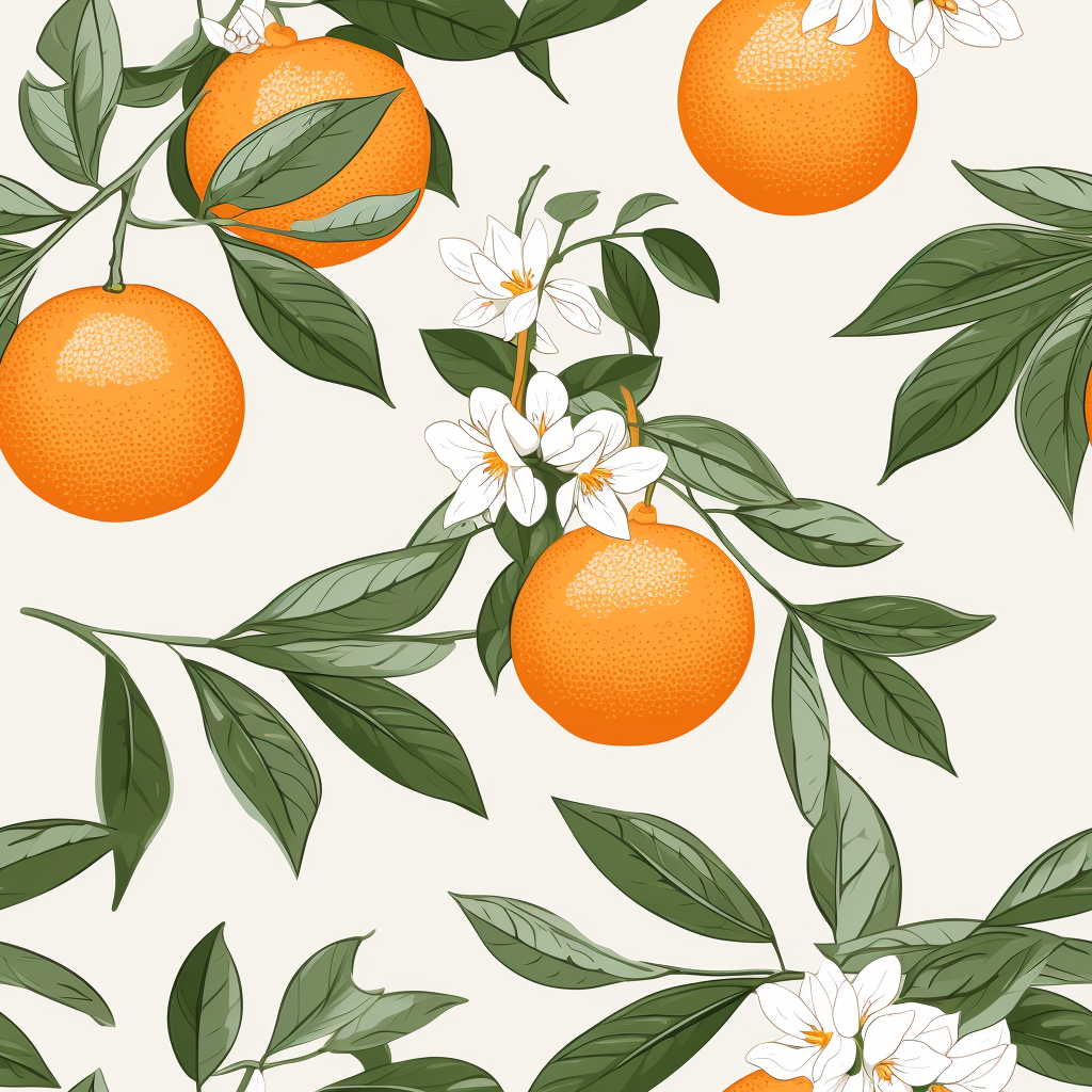 This seamless pattern features oranges and blossoms on a tree, surrounded by leaves and flowers. The white background makes the illustration pop, and the simple and elegant composition makes it versatile for various applications. The oranges and blossoms are depicted with realistic detail, giving the pattern a lifelike quality. The pattern is in the style of classic Japanese simplicity, drawing inspiration from artists such as Elba Damast and Prudence Heward. The high resolution of the pattern makes it perfect for large canvas sizes, and it can be used for wallpaper, wrapping paper, textiles, cushions, and more. The porcelain-like quality of the oranges on the branches makes it a perfect pattern for a sophisticated and stylish look.