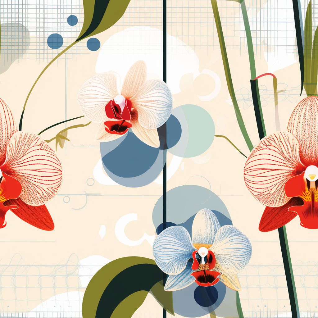 Download for Free!This seamless pattern is a beautiful blend of geometric shapes and floral motifs. With a realistic usage of light and color, the pattern features two flowers in tightly cropped compositions. The artwork is also layered with textures and patterns, giving it a chic, decorative background. While the pattern is realistic, it is also stylized, with smooth and curved lines that create a sense of lightness and transparency. The color palette includes light brown, red, green, white, orange and blue, giving the pattern a pop-art inspired feel. The floral studies are delicate, with fine lines and curves that add a touch of elegance to the pattern. The enigmatic tropics are also hinted at, making this pattern perfect for nature lovers. The pattern is versatile and can be used in a variety of applications, from fashion to home decor.