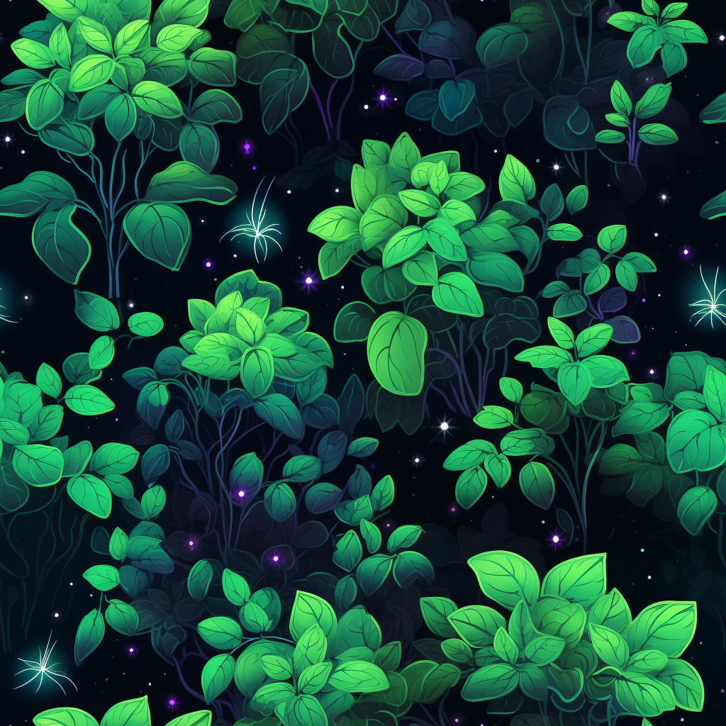 Download for Free!Step into a magical forest with this seamless pattern! The dark green background creates the perfect setting for the glowing plants and stars that seem to shine brighter than ever before. The plants are illustrated in a cartoon style, creating a playful and whimsical atmosphere. The composition is dreamlike, with attention paid to every detail, making it perfect for fairy tale illustrations, 2d game art, and cosmic landscapes. The pattern is versatile and can be used in a variety of projects. It is a perfect combination of detailed shading and vibrant color gradients. You will feel like you are in a fairytale world. The luminous 3d objects add to the surreal and magical feeling of the pattern. This pattern is perfect for anyone who loves fantasy and enchanting lighting. And who doesn't?