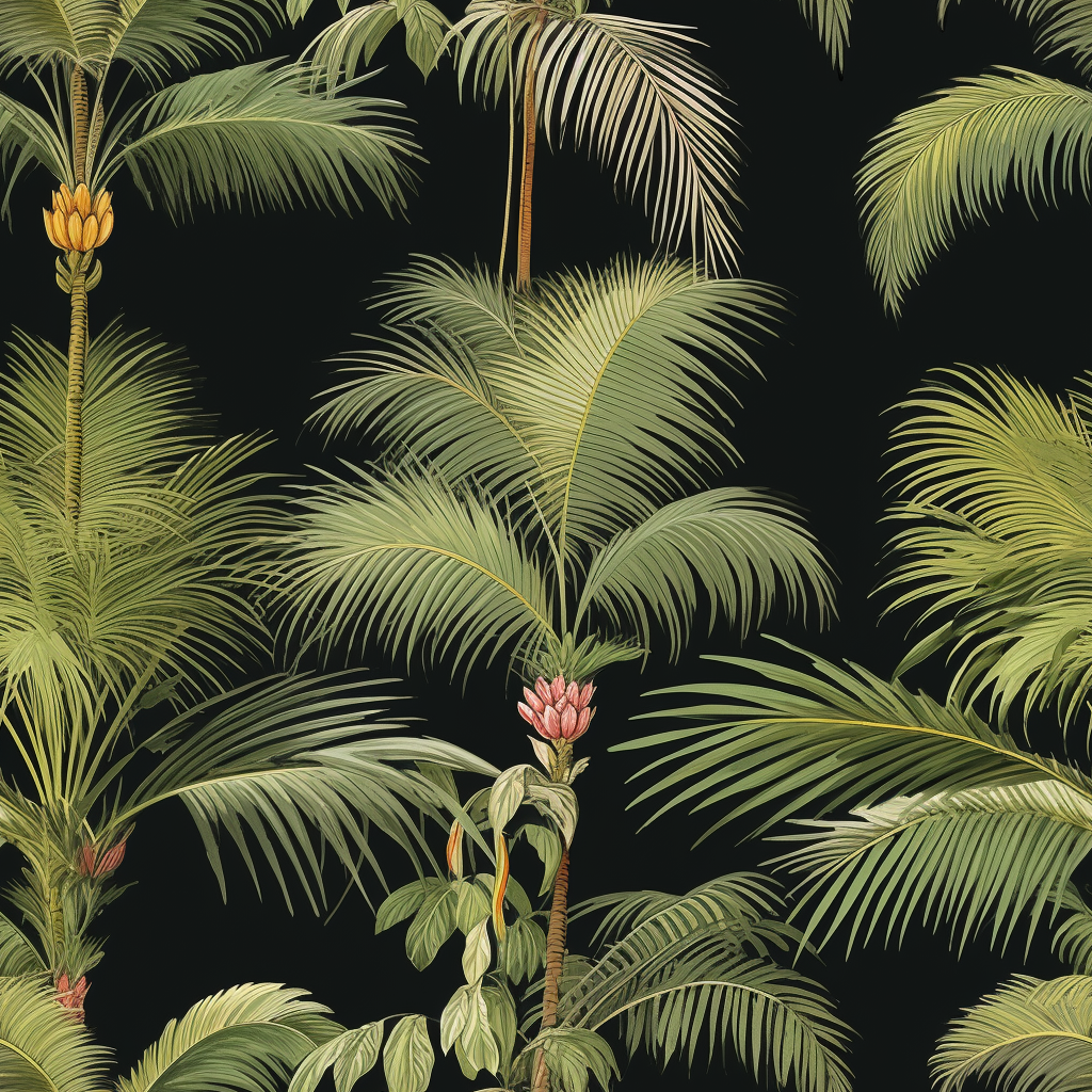 Download for Free!This wallpaper features ultrafine details of tropical palm trees set against a dark black background. The multi-panel composition and handcrafted designs give the pattern a distinctive character. The leaf patterns are rendered in realist fine details, while the botanical illustrations and fauna and flora accuracy lend the design an air of sophistication. The elaborate borders add a touch of elegance to the overall composition. The wallpaper is inspired by the romanticized depictions of wilderness found in the works of Grégoire Guillemin, Marianne North, Rosa Bonheur, and Debbie Criswell. Bring the beauty of nature into your home with this stunning wallpaper.