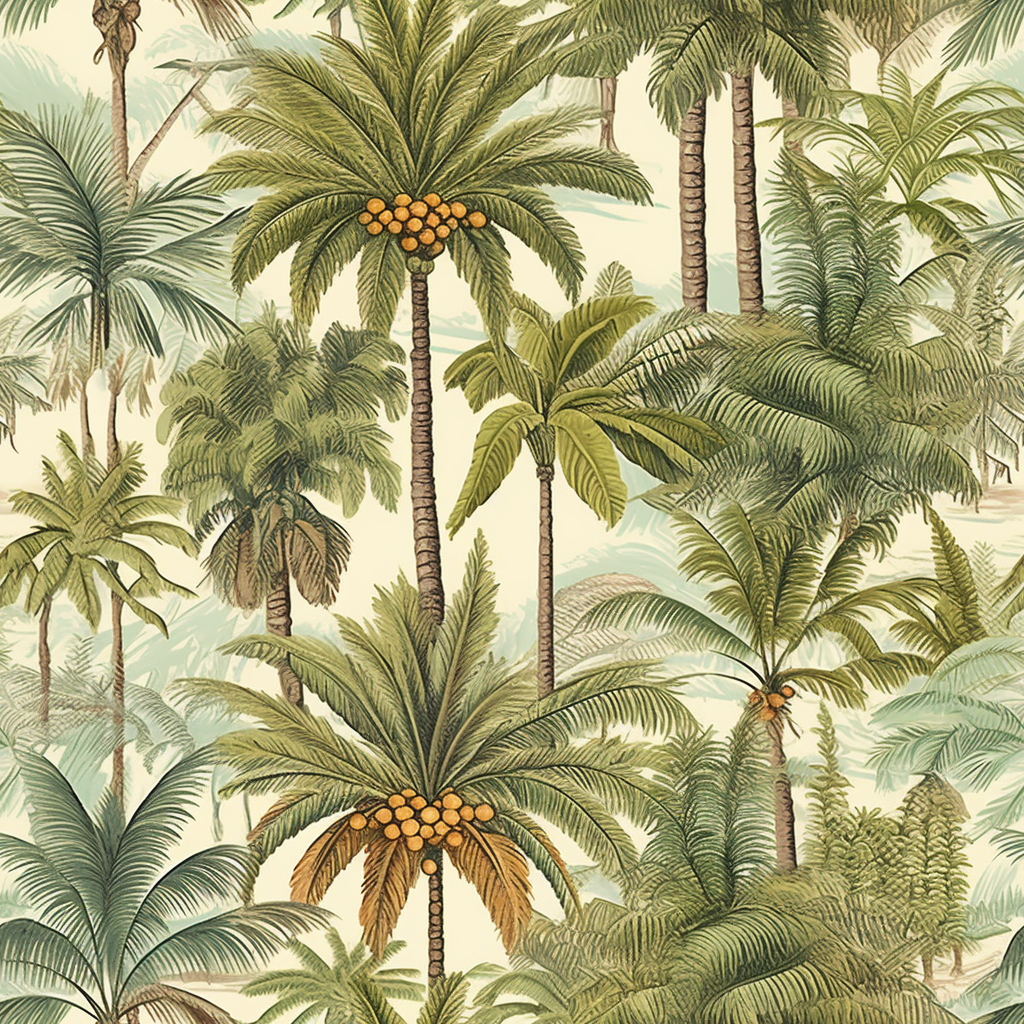 Download for Free!This wallpaper features a beautiful and highly detailed illustration of palm trees in a tropical setting. The light brown and emerald color palette creates a nostalgic and dreamy atmosphere, while the layered fabrications add depth and texture. The wallpaper is available in a high resolution and large canvas format, making it perfect for any size room. The palm tree imagery is lush and detailed, with each leaf and frond carefully rendered to create a lively and verdant landscape. The wallpaper would be a great addition to any home or office that needs a touch of nature and tranquility. Fun fact: the wallpaper was developed using the caffenol developing process, which uses coffee and vitamin C instead of traditional chemicals.