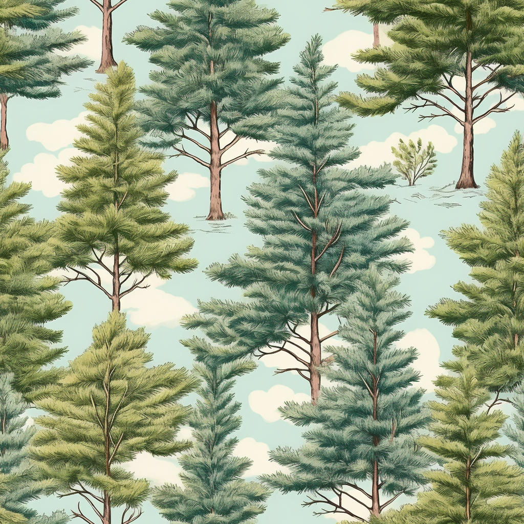 Download for Free!This pattern features realistic botanical illustrations of pine trees and clouds in shades of green and blue. The detailing of the trees is highly naturalistic, with luxurious and earthy tones that transport you to a sublime wilderness. The digital illustrations are highly detailed, with high-contrast shading that brings depth to the design. The pattern is reminiscent of the aesthetic movement, with grandeur of scale and opulent fabrics. The design is perfect for those who want to bring the beauty of nature into their homes.