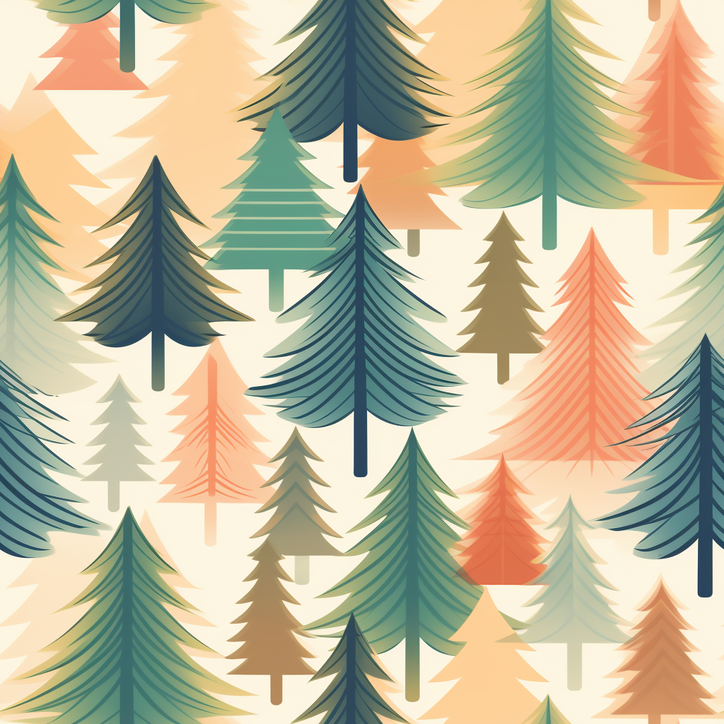 Download for Free!Our Festive Pine Trees pattern is a seamless design featuring colorful woodcarvings of pine trees. The minimalist illustration style is reminiscent of mid-century vintage poster art, with soft gradients and muted tones that create a cozy atmosphere. The pattern is perfect for adding a touch of nature to your project, without overwhelming the design. The pine trees are arranged in a variety of ways, creating a dynamic visual experience. The seamless design allows the pattern to be tiled seamlessly, making it perfect for use as wallpaper or fabric. The soft, tonal colors used in the pattern are inspired by realistic landscapes, with a vintage twist. The woodcarving-inspired design is perfect for those who appreciate nature-inspired abstractions.