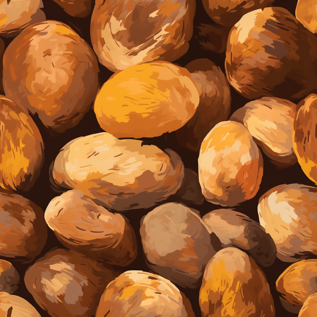 Download for Free!This pattern features a repeating design of various harvest foods including potatoes, almonds, cranberries, and acorns. The texture of the foods is rendered in a realistic style with painterly brushwork, giving them a naturalistic and organic feel. The neogeo style repetition and bulbous shapes make for an interesting and unique design. The background of the pattern features a light yellow and dark brown post-impressionist style with realistic renderings of the human form. The dusty piles and dry wit humor add an unexpected touch of whimsy to the design. The flat shading of the acorns adds a touch of contrast to the overall texture of the piece. This design would make a great addition to any fall or harvest-themed project.