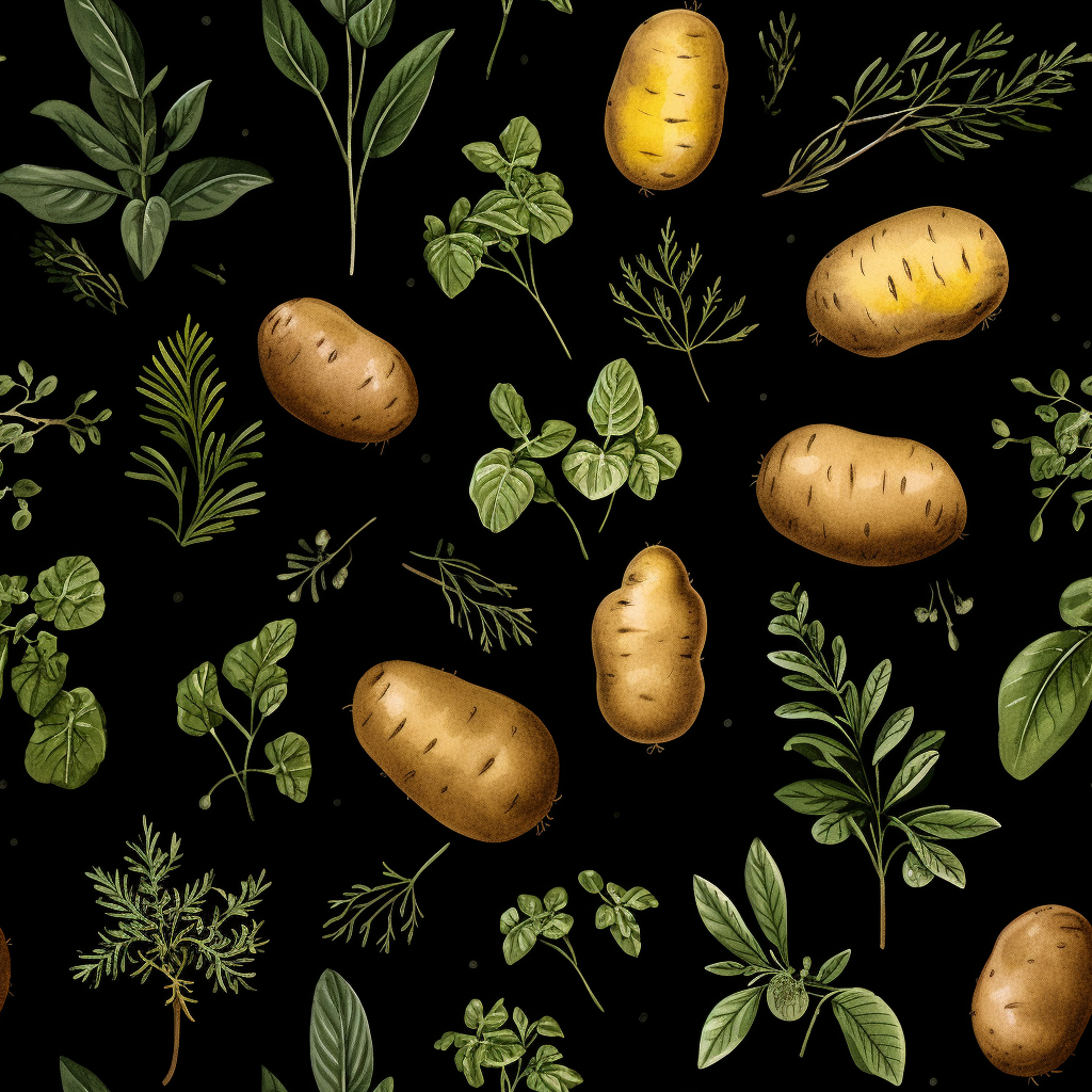 Download for Free!This bountiful pattern showcases a seamless arrangement of potatoes, aromatic rosemary and fragrant herbs on a dramatic black background. The highly detailed illustration is reminiscent of the golden age of botanical illustrations, but with a modern twist. The organic materials and lifelike rendering of the elements make it feel as if you could reach out and touch the potatoes and herbs. The pattern is perfect for anyone who loves to cook or appreciates the beauty of nature. Its dark and earthy tones evoke a sense of warmth and comfort, making it an ideal choice for home décor or kitchen accessories. Fun fact: the pattern is inspired by the works of Edward Poynter, Jean-Léon Gérôme and Robert Irwin.