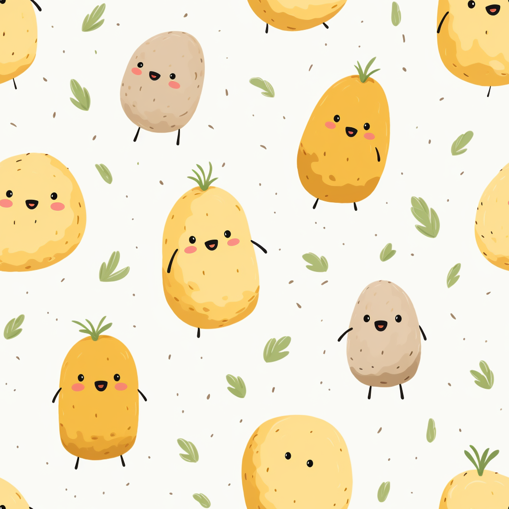 Download for Free!Potato Party is a seamless pattern featuring cute potato characters with green leaves on a white background. The characters are illustrated in a playful style with soft brushwork and textural richness. The yellow and maroon colors add a pop of color to the design. The pattern is inspired by organic textures and incorporates elements of pigeoncore, tupinipunk, and aurorapunk. The characters are designed with accurate and detailed expressions, making them feel alive and full of personality. The use of playful textures adds an extra layer of charm to the design. This high-resolution pattern is perfect for adding a touch of whimsy to any project!