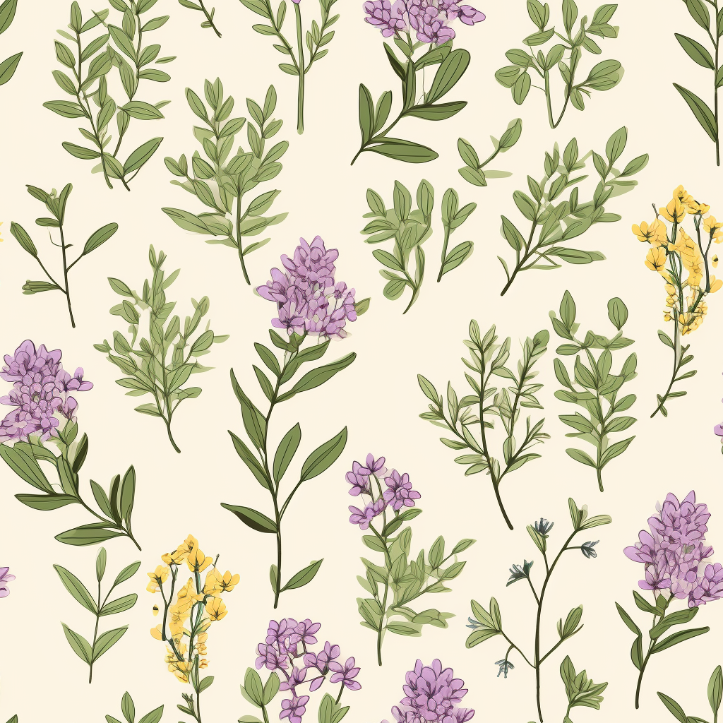 This seamless pattern is a blooming harmony of purple and yellow flowers with the freshness of thyme and lavender.