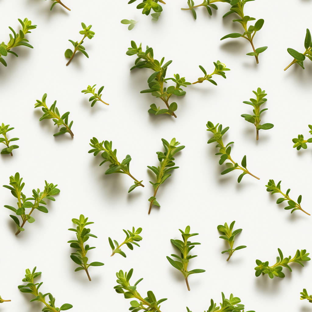 This pattern features a repeating design of thyme leaves layered on a green background. The leaves are arranged in a way that gives the pattern an aerial view effect. The color green and the white background give the pattern a nature-based look. The pattern also has an iconic feel to it, with the leaves arranged in a precise and sharp manner. The pop-culture infusion adds a playful element to the design. The thyme leaves are easily recognizable, making the pattern perfect for kitchen-related items.