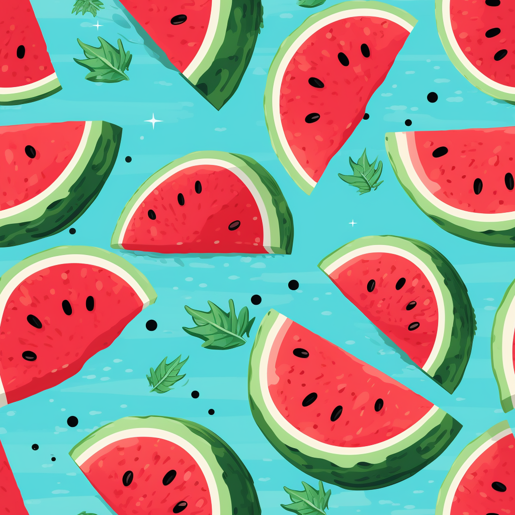 Download for Free!This seamless watermelon pattern features slices of juicy watermelon with leaves on a sky-blue background. The playful visual puzzles and vibrant murals make this pattern perfect for adding a touch of whimsy to any project. The cartoonish features and flat shapes give it a fun, lighthearted feel, while the bold graphic design elements and high resolution make it a top-quality design. The repeating pattern is inspired by nature-based patterns and the aquarellist style, and the simplified forms and shapes create a comic-strip imagery. The blue and red colors are reminiscent of a fun summer day, and the emerald green leaves add a pop of contrasting color. This beautiful graphic design is perfect for anyone looking to add a touch of playfulness to their space.
