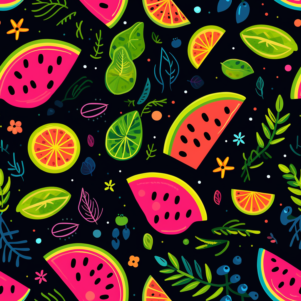 Download for Free!This watermelon-inspired seamless pattern features bright and bold colors such as lime green and light red, against a black background. The pattern includes large watermelon slices, leaves, and small dots that add interest and depth. The playful and cute design is reminiscent of a cartoon, and is perfect for a range of projects. You can use it to create vibrant florals, colorful animations, or even a nature-inspired piece. The pattern also features mismatched shapes and patterns that add an offbeat whimsy to the design. The artist has drawn inspiration from various sources, including African-inspired textile patterns and organic and fluid designs. The result is a lively and fun pattern that is both organic and pictorial. The watermelon fiesta also includes vegetables such as radishes and mint, which add a playful touch to the design.