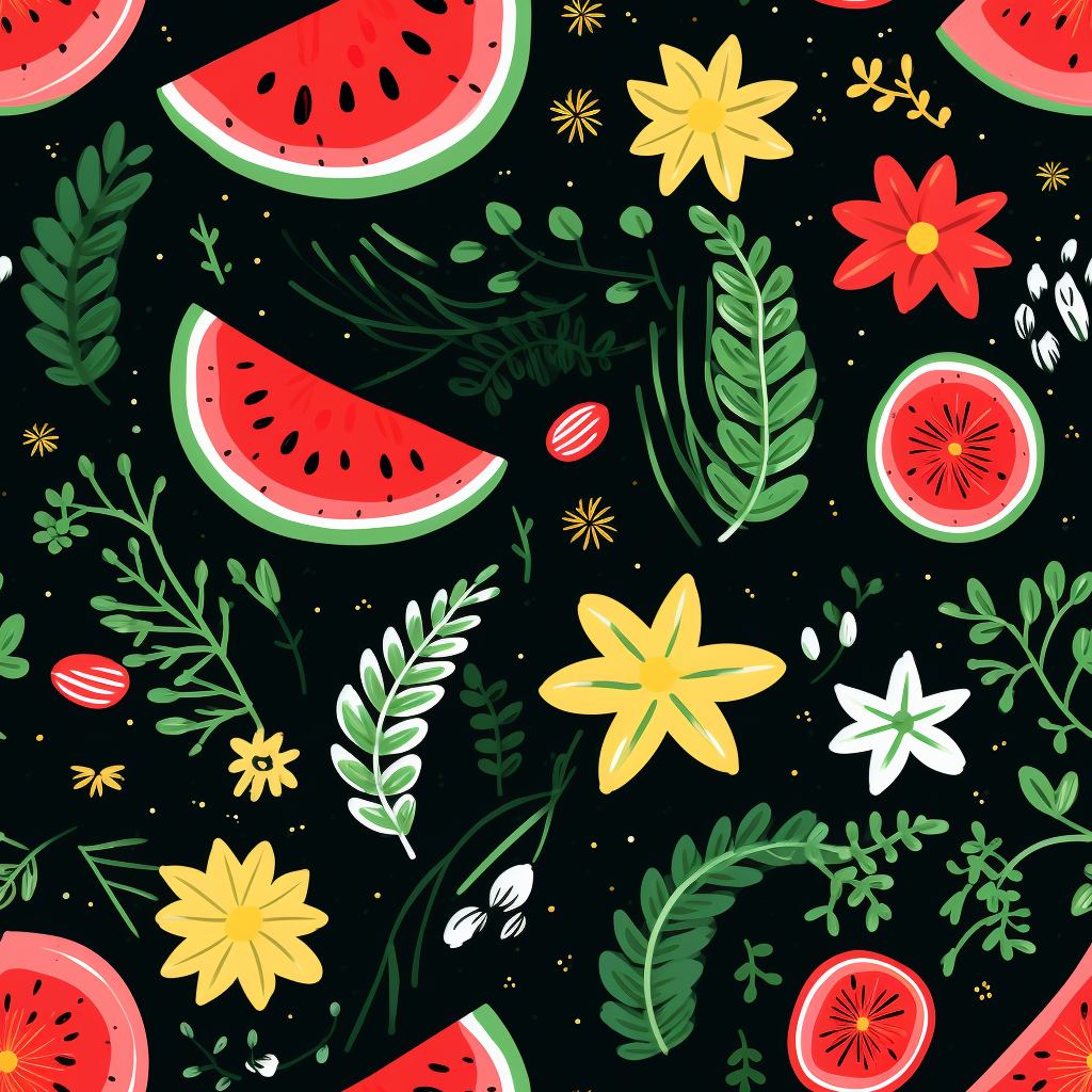 Download for Free!Our 'Watermelon Whimsy' pattern features a stunning botanical illustration of a watermelon, complete with flowers and other nature-inspired motifs. The design is hand-drawn and packed with vibrant, lively hues that are sure to catch the eye. This whimsical pattern is perfect for adding a touch of summer fun to any project or space. The black background adds depth and contrast to the colorful animations, creating a striking visual effect. The illustrations are flat and graphic, with woodcut-inspired graphics that give the pattern a folk-inspired feel. The ink drawing seamless pattern with fruits, watermelon, and pineapple, features dark green and red, flower, and nature motifs, flat shapes, black background, cute cartoonish designs, packed with hidden details, organic shapes, and curved lines. This pattern is a must-have for anyone looking to add a touch of playful charm to their designs!